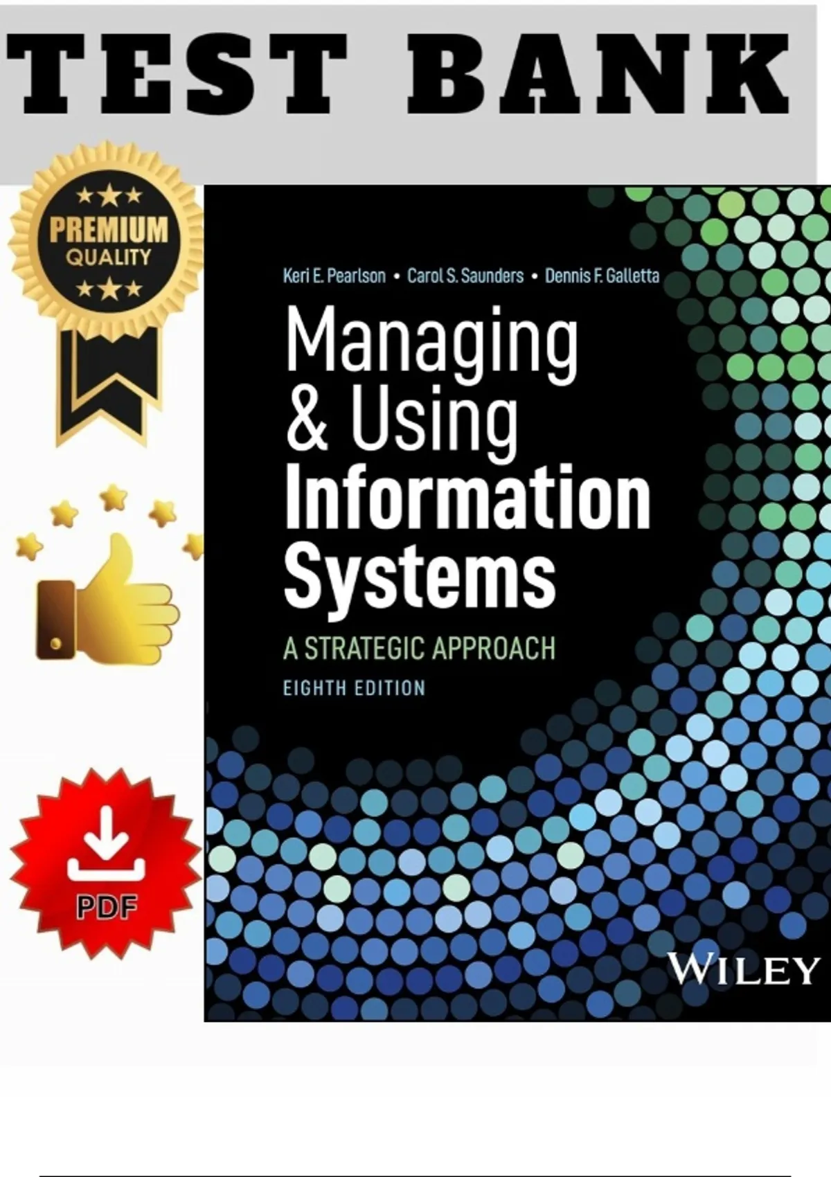 Complete 2025 Test Bank for Managing & Using Information Systems (8th Ed). All chapters included. Perfect for exam prep and coursework success. Access the complete Test Bank for Managing & Using Information Systems: A Strategic Approach, 8th Edition by Pearlson, Saunders, and Galletta (2025 version). Includes all chapters (1–13) with accurate questions and answers to help students understand strategic IT management, business information systems, and prepare effectively for exams and coursework.
