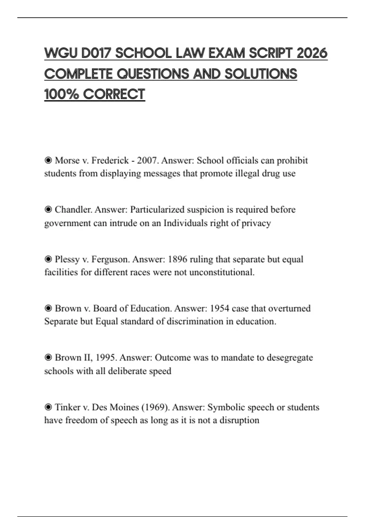 WGU D017 SCHOOL LAW EXAM SCRIPT 2026 COMPLETE QUESTIONS AND SOLUTIONS 100% CORRECT