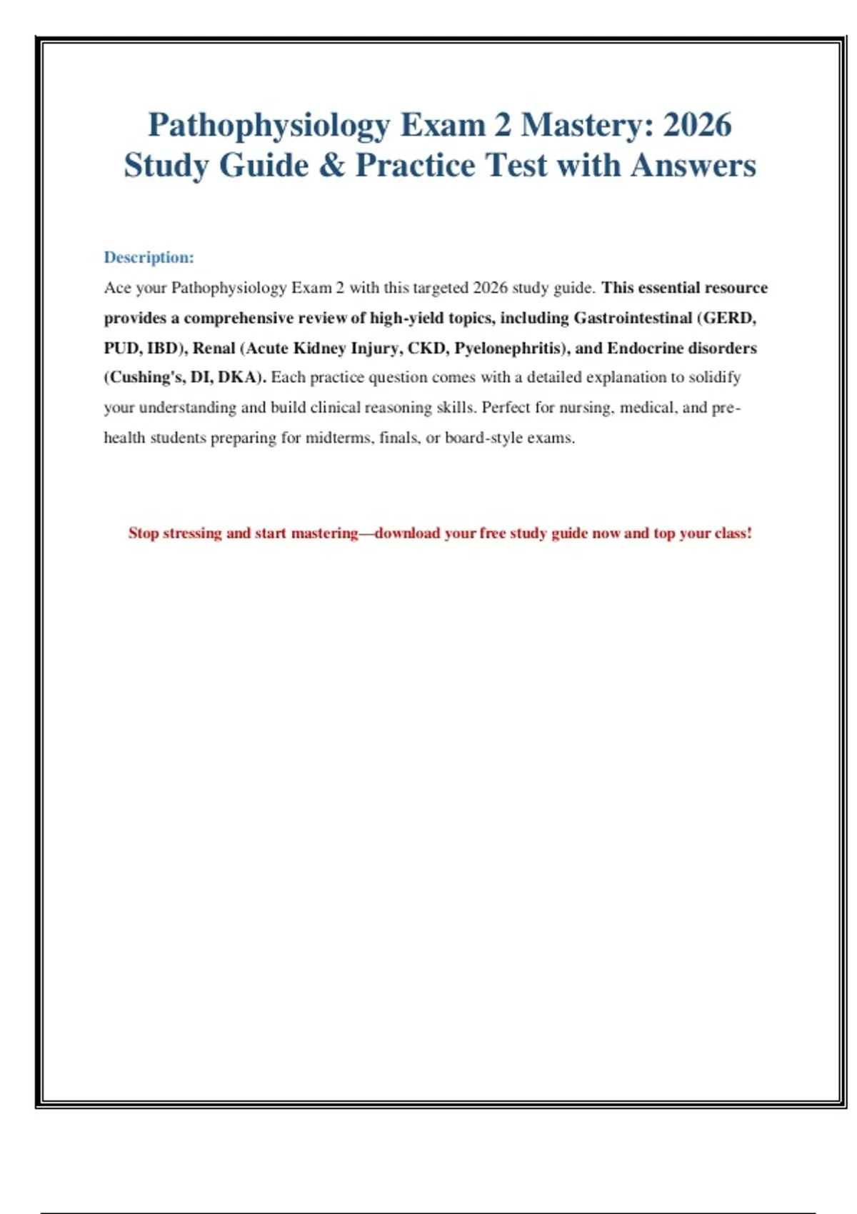 Ace your Pathophysiology Exam 2 with this targeted 2026 study guide. This essential resource provides a comprehensive review of high-yield topics, including Gastrointestinal (GERD, PUD, IBD), Renal (Acute Kidney Injury, CKD, Pyelonephritis), and Endocrine disorders (Cushing's, DI, DKA). Each practice question comes with a detailed explanation to solidify your understanding and build clinical reasoning skills. Perfect for nursing, medical, and prehealth students preparing for midterms, finals, or board-style exams.