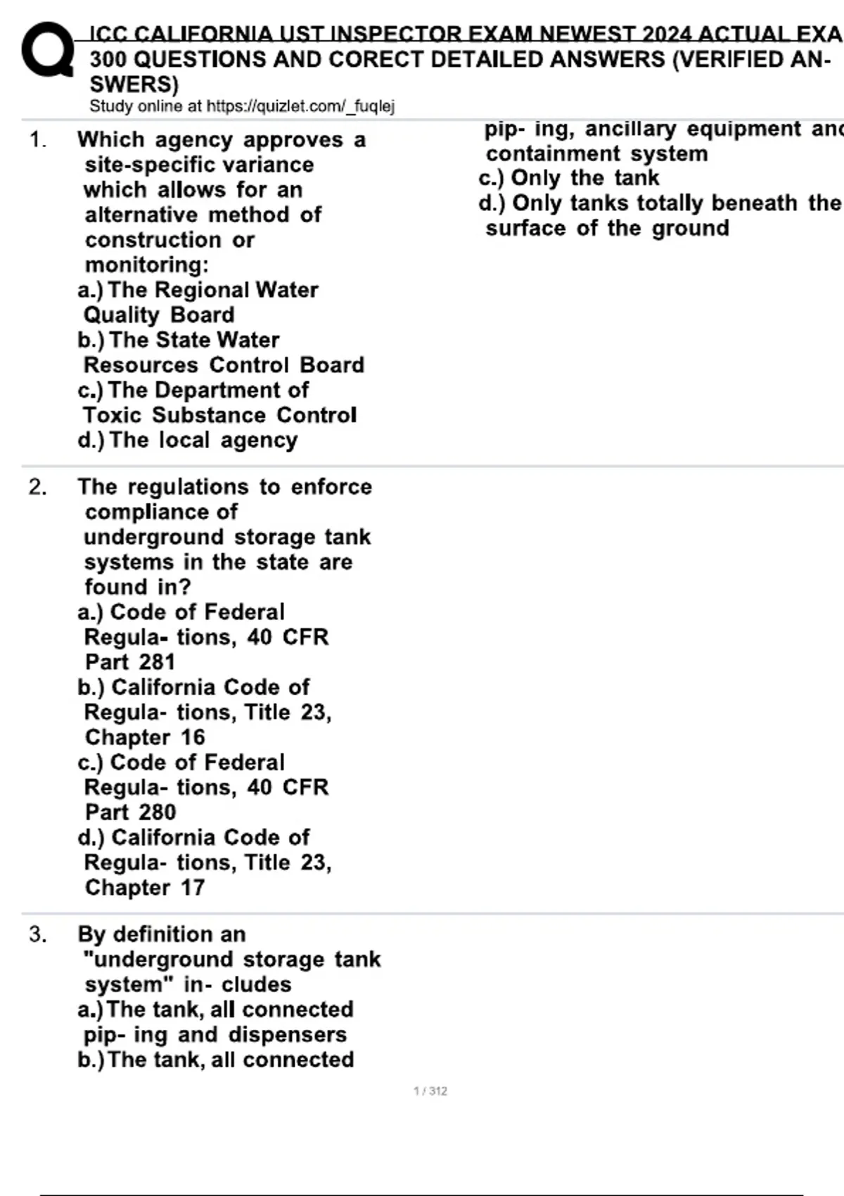 This essential study guide for the International Code Council (ICC) California Underground Storage Tank (UST) Inspector Exam features the newest 2024 actual exam questions and 300 correct, detailed, and verified answers. It is the definitive resource for mastering UST compliance and regulations in California. Key topics covered include: the legal definition of a UST system (tank, all connected piping and dispensers), state regulatory requirements (California Code of Regulations, Title 23, Chapter 16), the approval process for alternative methods (Site-Specific Variance by the State Water Resources Control Board), and inspection protocols (e.g., daily owner/operator inspections, direct viewing for floor monitoring). This resource is crucial for passing your ICC certification on the first attempt.