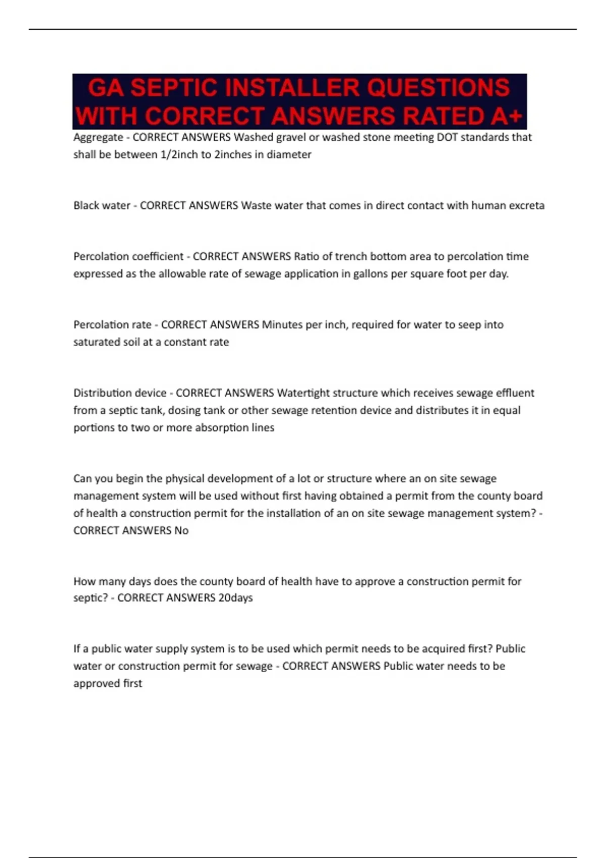 GA SEPTIC INSTALLER QUESTIONS WITH CORRECT ANSWERS RATED A+