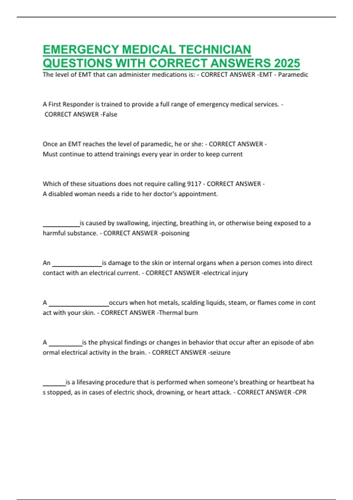 EMERGENCY MEDICAL TECHNICIAN QUESTIONS WITH CORRECT ANSWERS 2025.