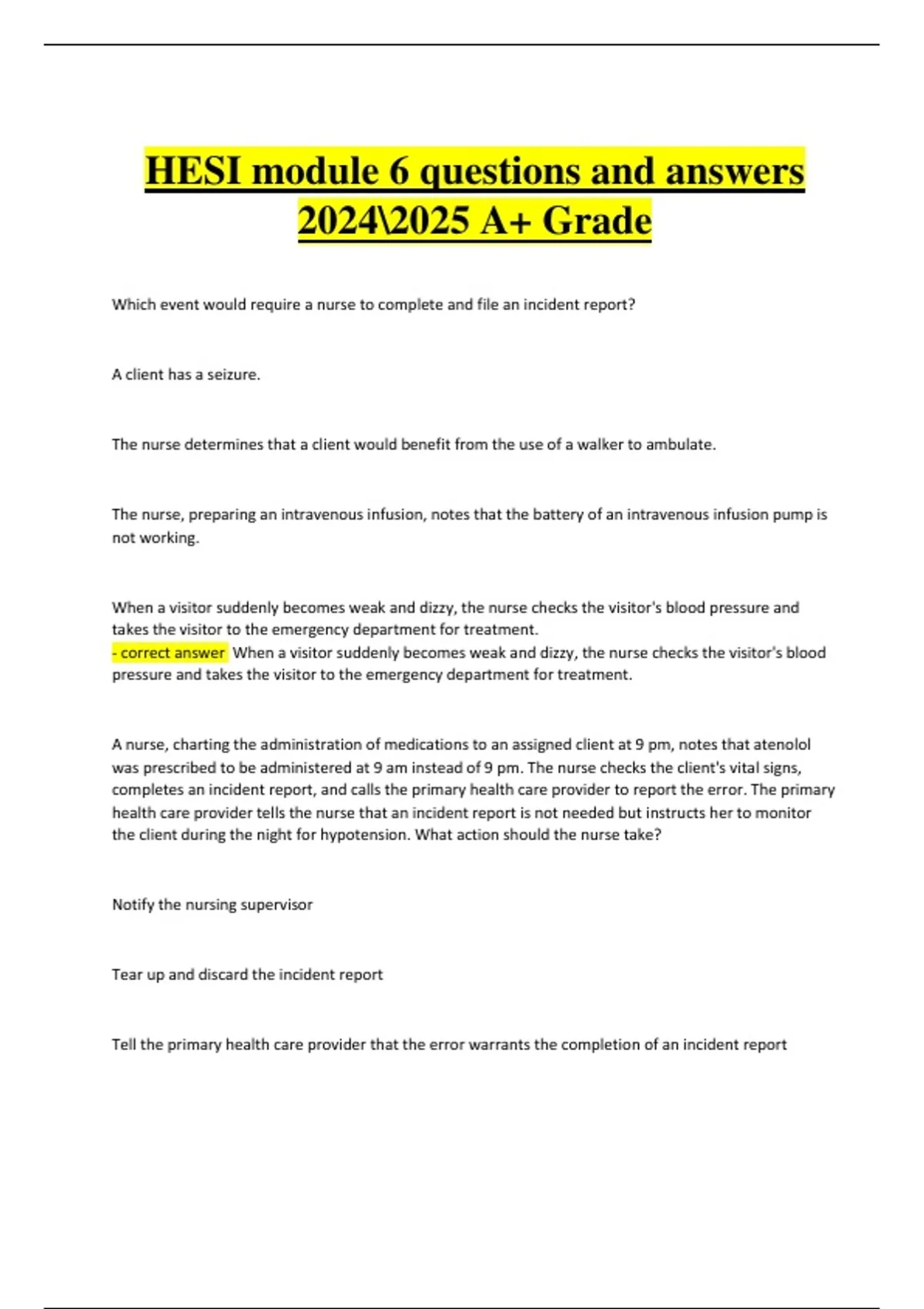 assesses the client, completes an incident report, and notifies the primary health care provider and