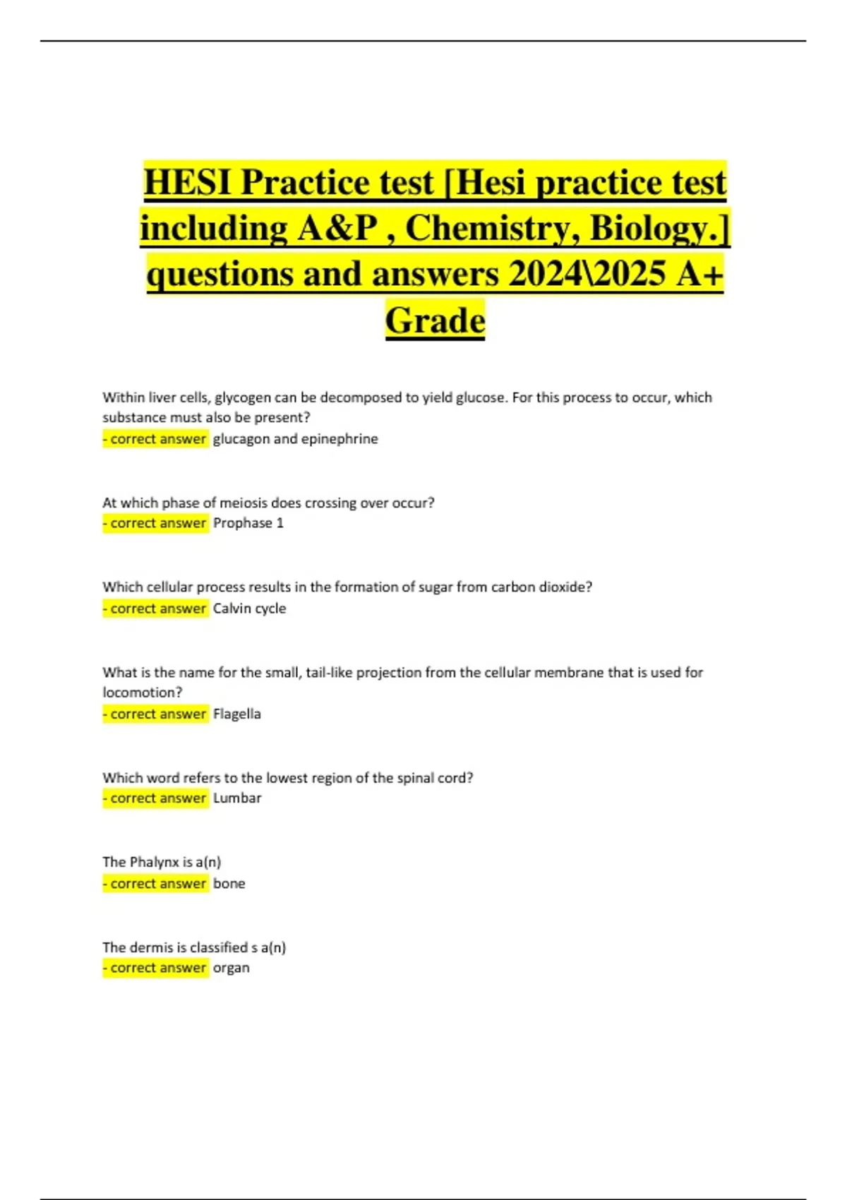 This verified A+ graded HESI Practice Test covers Anatomy & Physiology, Chemistry, and Biology with accurate, up-to-date questions and correct answers. Each section is designed to reflect the real HESI Entrance Exam format, helping students strengthen core science knowledge and test readiness. Perfect for nursing and allied health applicants preparing for the HESI A2 or related admission exams.