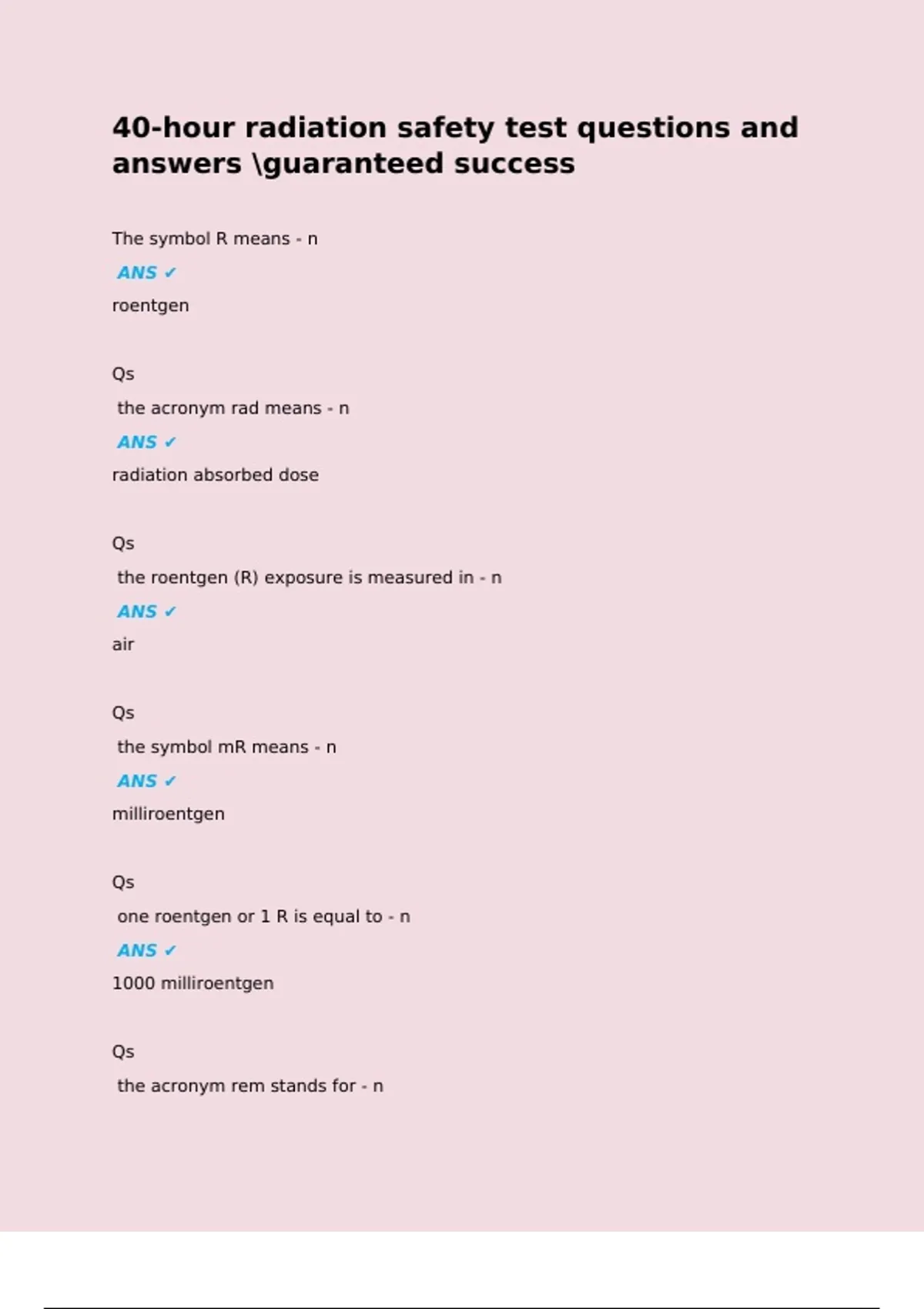 40-hour radiation safety test questions and answers guaranteed success The symbol R means - n ANS roentgen Qs the acronym rad means - n ANS radiation absorbed dose Qs the roentgen (R) exposure is measured in - n ANS air Qs the symbol