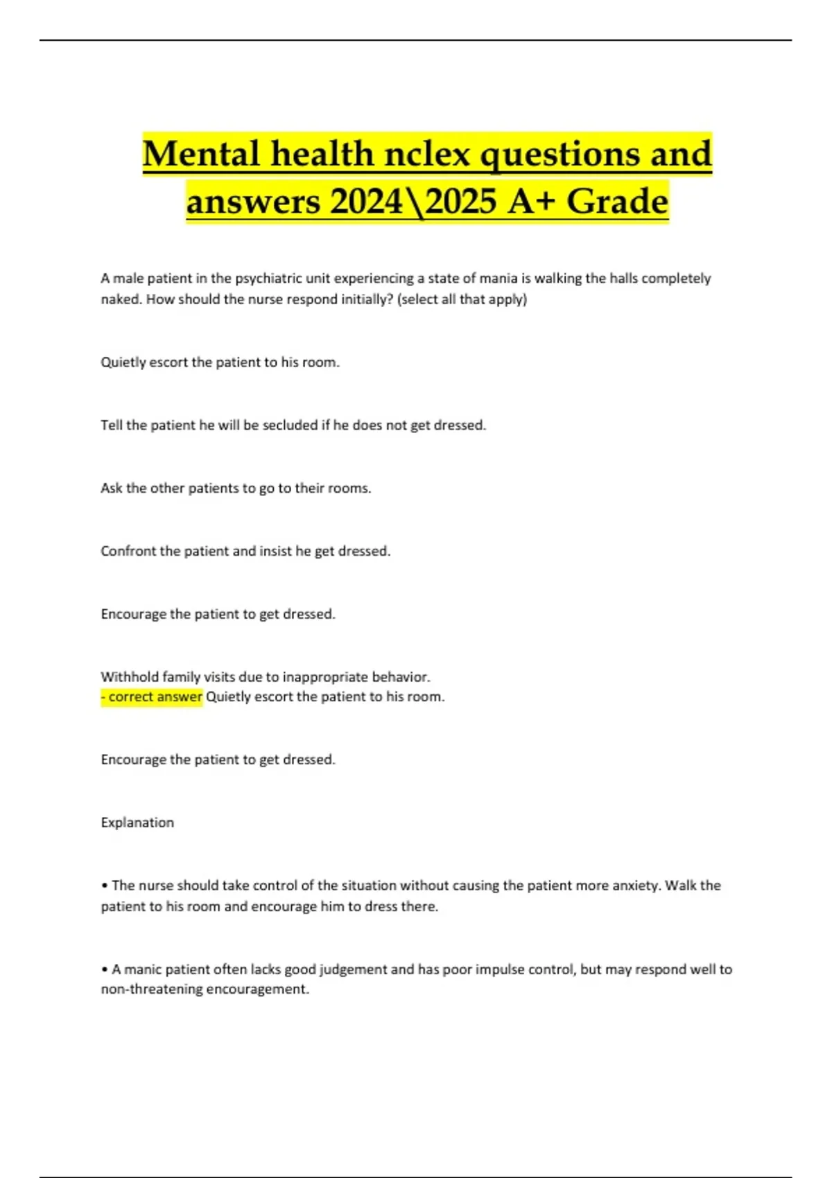 - correct answer Quietly escort the patient to his room.
