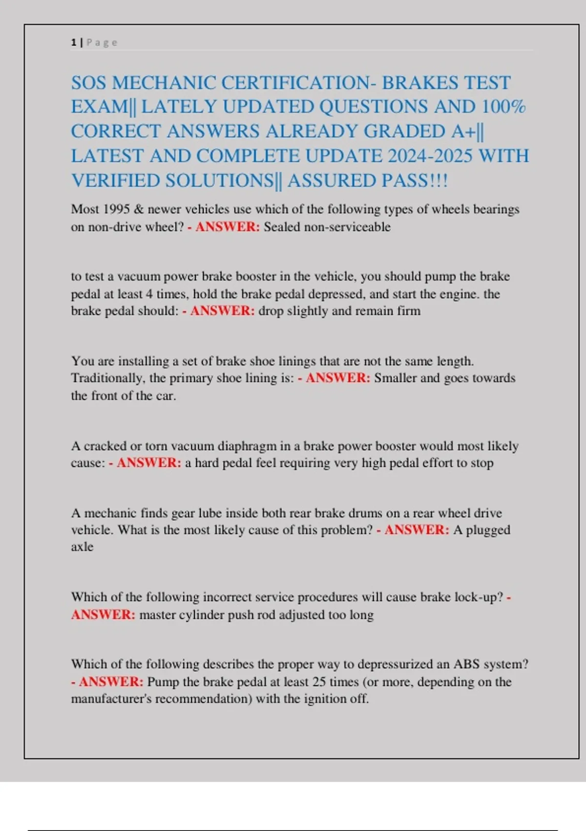 SOS Mechanic Certification Brakes Exam | Verified Questions & Answers Study Guide 2025