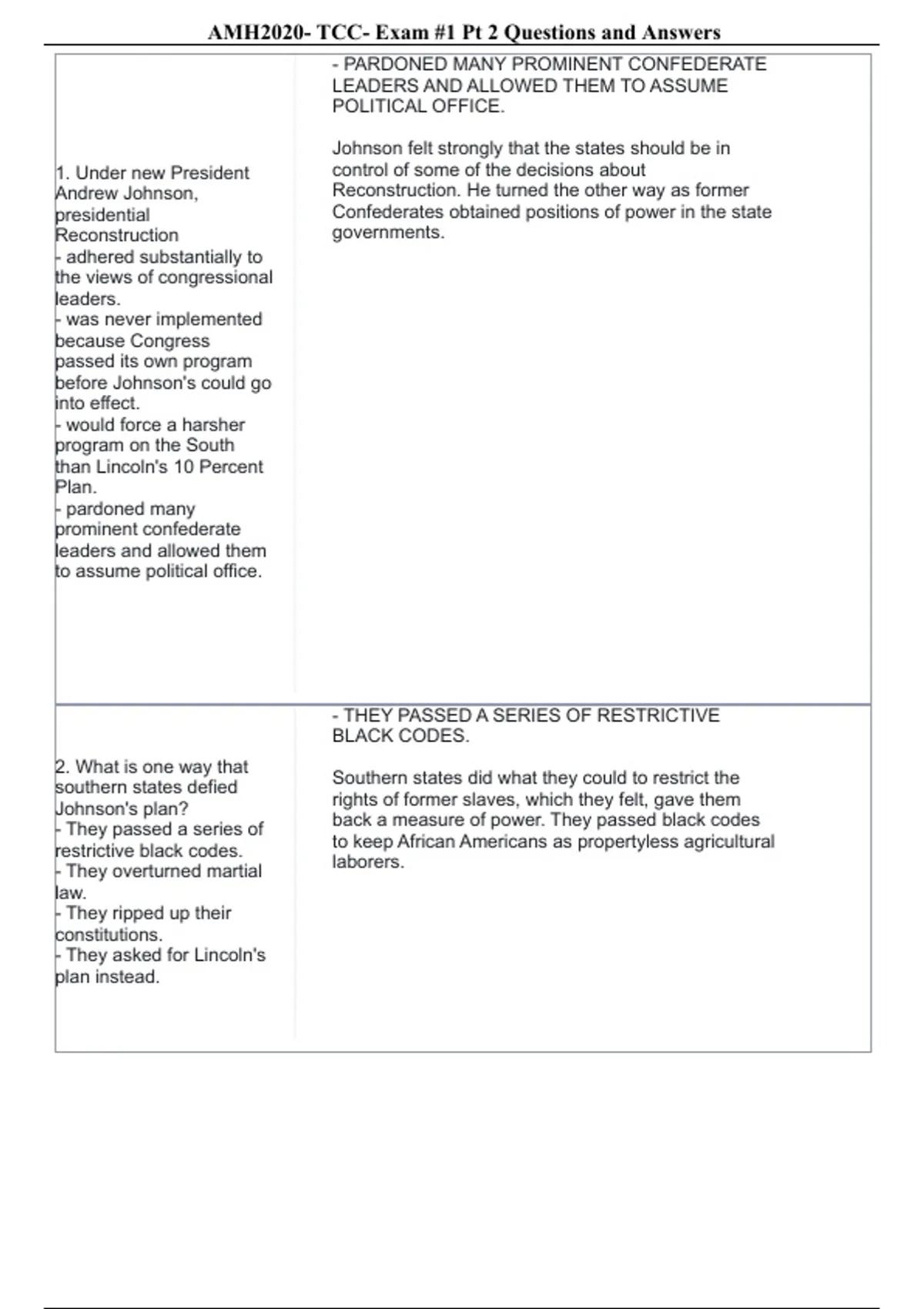 AMH2020 TCC Exam 1 Part 2, AMH 2020 U.S. History Study Guide, Tallahassee Community College History Exam, U.S. History Since 1877 Questions and Answers, AMH2020 Exam Review 2025, College History Exam Prep, American History Practice Questions, AMH 2020 Test Solutions, Reconstruction to Modern America