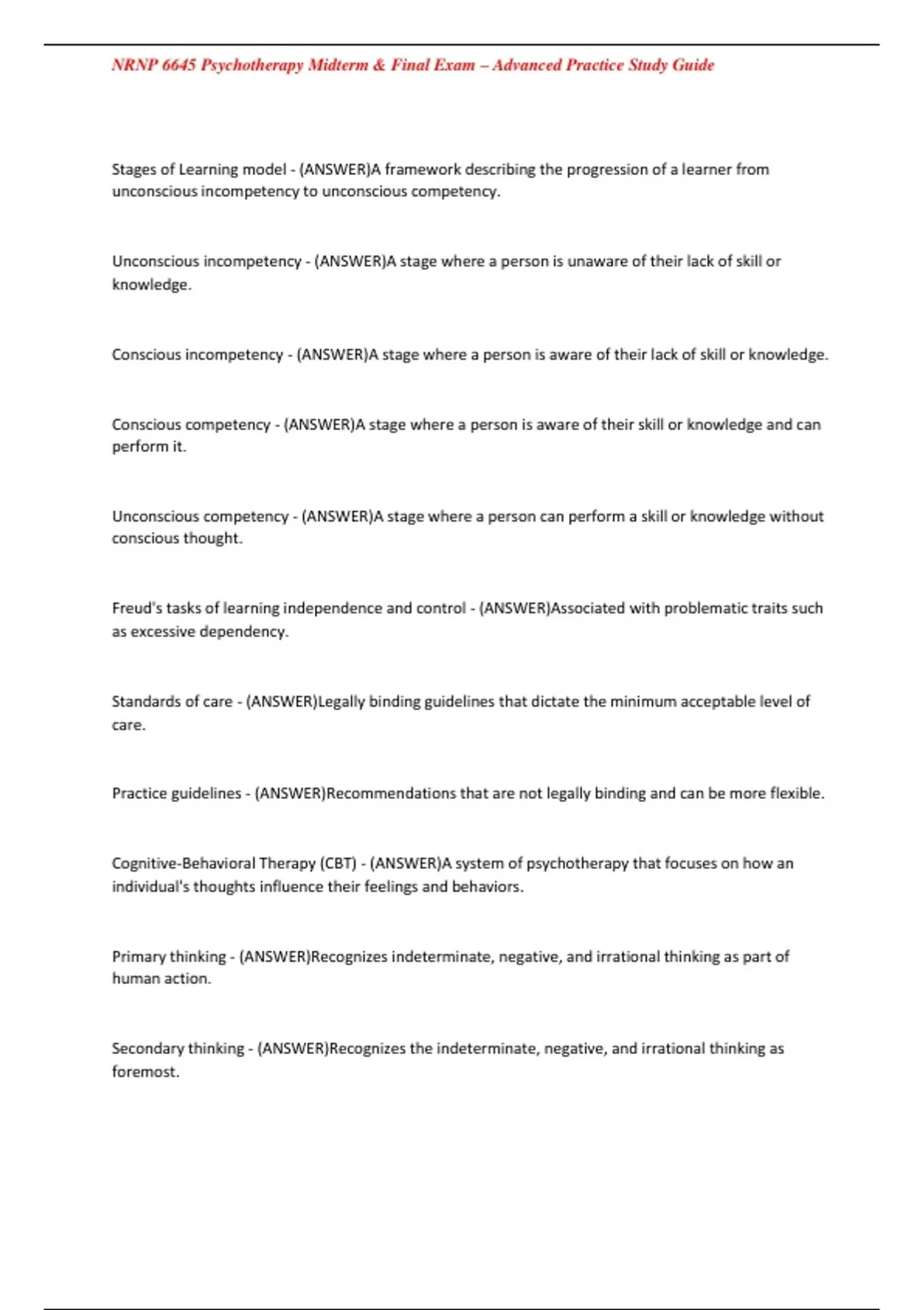 , NRNP 6645 Psychotherapy Midterm & Final Exam – Advanced Practice Study Guide