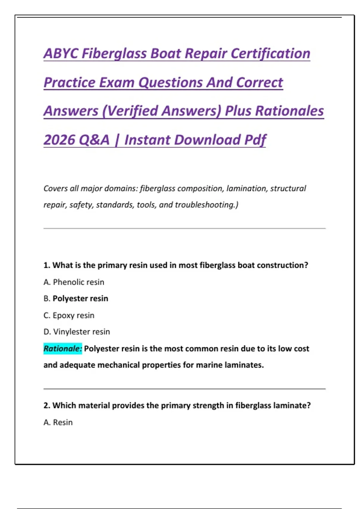 ABYC Fiberglass Boat Repair Certification Practice Exam Questions And Correct Answers (Verified Answers) Plus Rationales 2026 Q&A | Instant Download Pdf