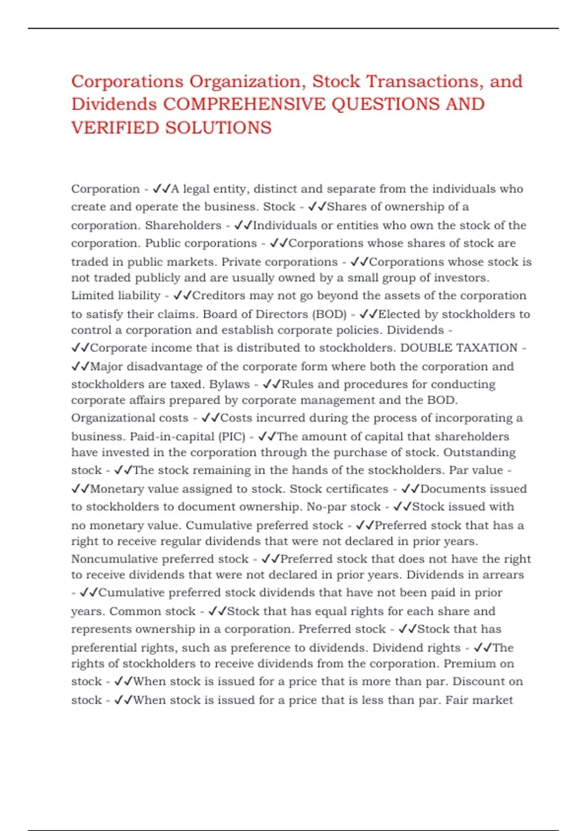Corporations Organization, Stock Transactions, and Dividends COMPREHENSIVE QUESTIONS AND VERIFIED SOLUTIONS