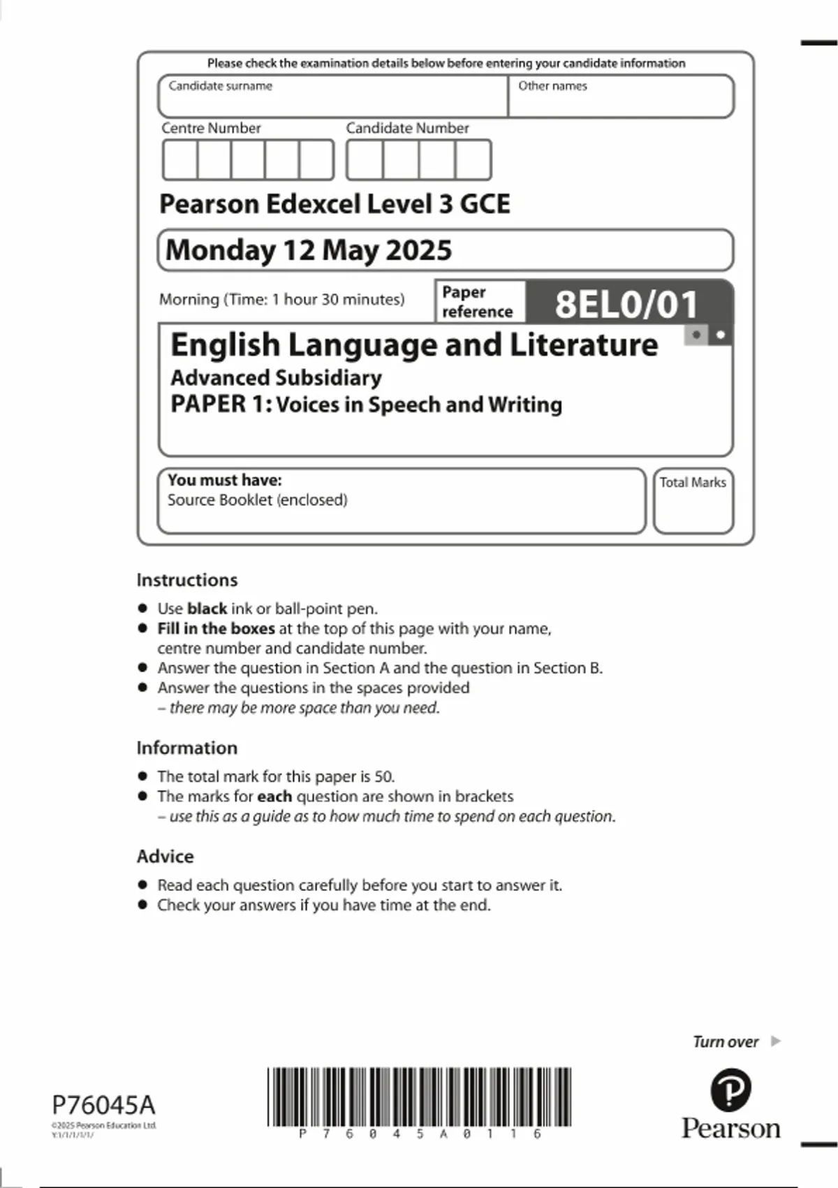 Pearson Edexcel AS Level 3 GCE English Language and Literature PAPER 1 2025 (8EL0/01:Voices in Speech and Writing)