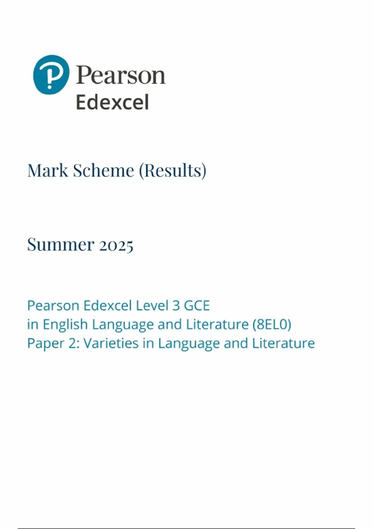 Pearson Edexcel AS Level 3 GCE English Language and Literature paper 2 mark scheme 2025 (8L0/02:Voices in Speech and Writing)