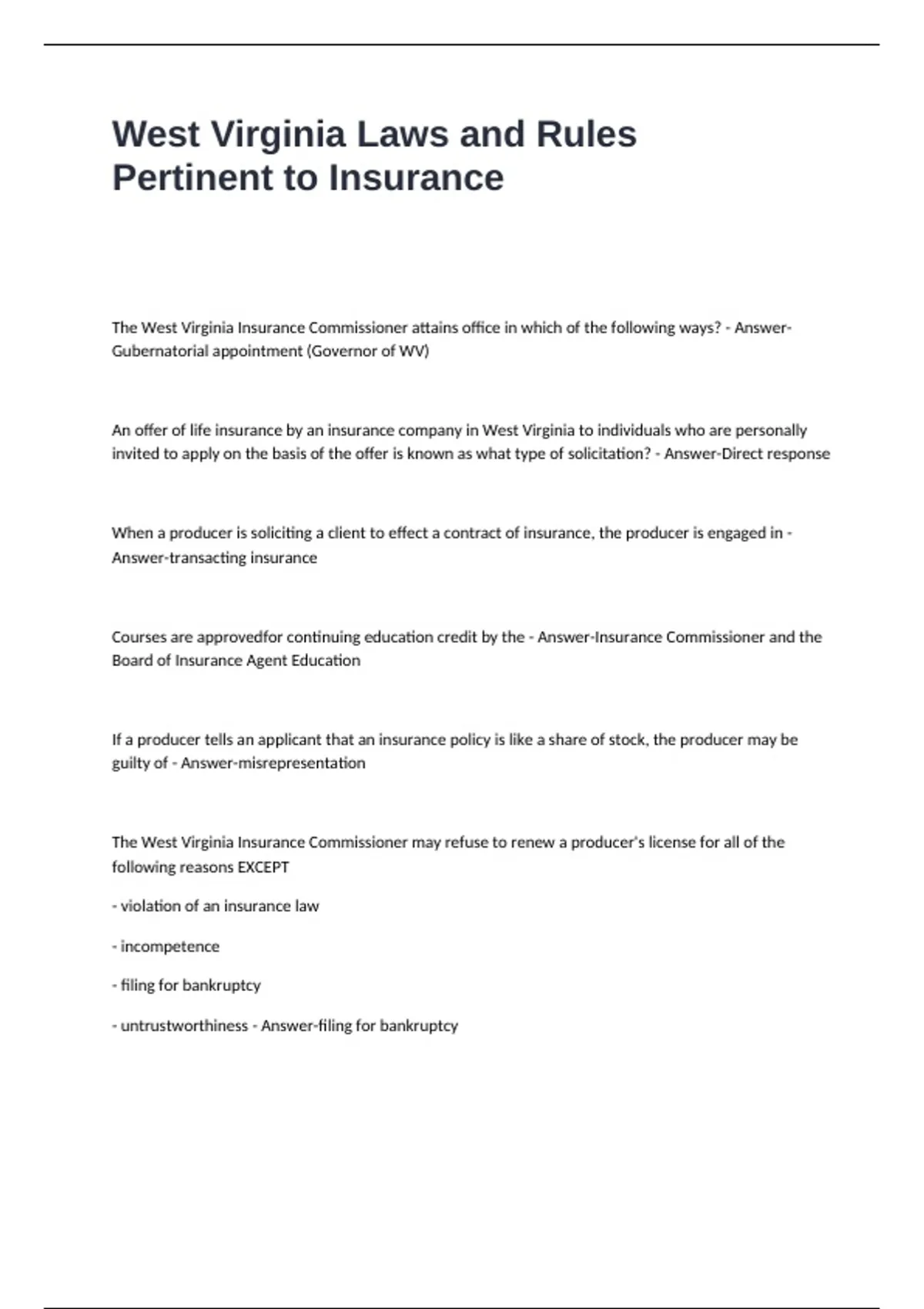 West Virginia Laws and Rules Pertinent to Insurance Exam Questions and Answers