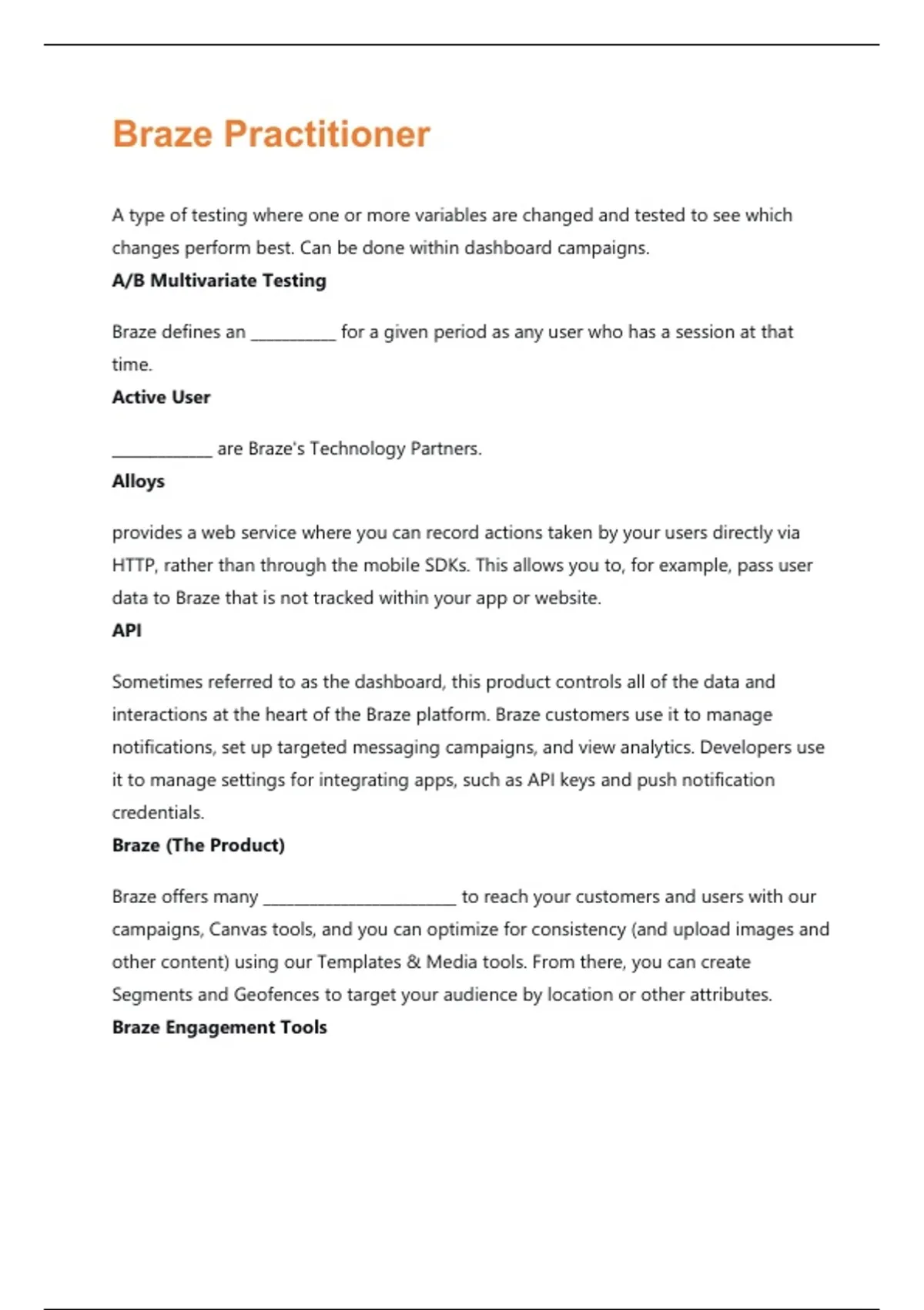 A type of testing where one or more variables are changed and tested to see which changes perform best. Can be done within dashboard campaigns. A/B Multivariate Testing Braze defines an ___________ for a given period as any user who has a session at that time. Active User _____________ are Braze's Technology Partners. Alloys provides a web service where you can record actions taken by your users directly via HTTP, rather than through the mobile SDKs. This allows you to, for example, pass user data to Braze that is not tracked within your app or website. API Sometimes referred to as the dashboard, this product controls all of the data and interactions at the heart of the Braze platform. Braze customers use it to manage notifications, set up targeted messaging campaigns, and view analytics. Developers use it to manage settings for integrating apps, such as API keys and push notification credentials. Braze (The Product) Braze offers many _________________________ to reach your customers and users with our campaigns, Canvas tools, and you can optimize for consistency (and upload images and other content) using our Templates & Media tools. From there, you can create Segments and Geofences to target your audience by location or other attributes. Braze Engagement ToolsBraze Admins can divide a subset of dashboard users into ____________ with varying user roles and permissions. This allows Braze Admins to limit access to certain features by group membership. Braze Teams A customizable messaging method to deliver personalized response to your customers. You can ____________ using different messaging channels to send your unique messages. Campaigns