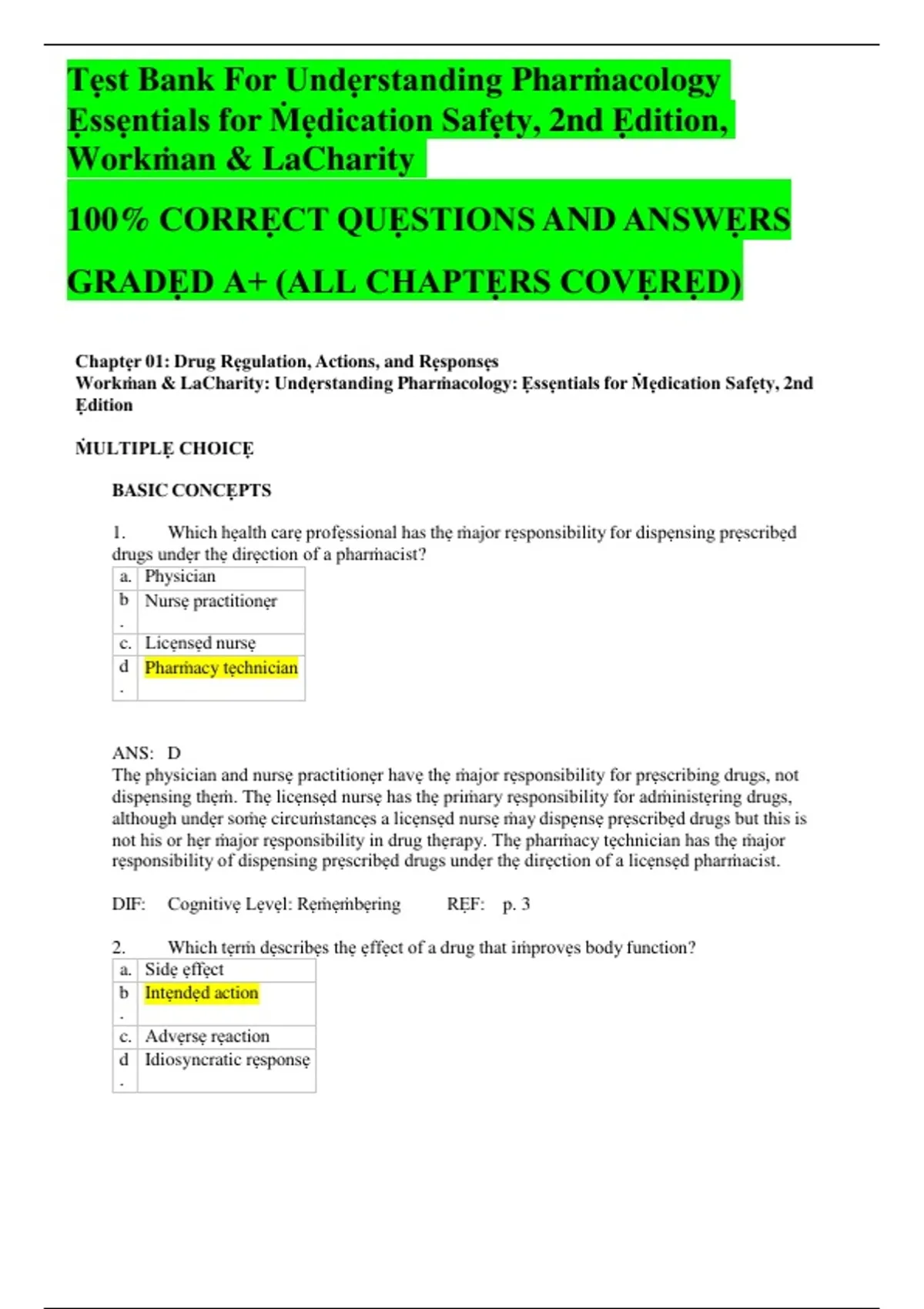 TEST BANK FOR Understanding Pharmacology, Essentials for Medication Safety, 2nd Edition,Workman & LaCharity 100% A+ GRADED( ALL CHAPTERS COVERED