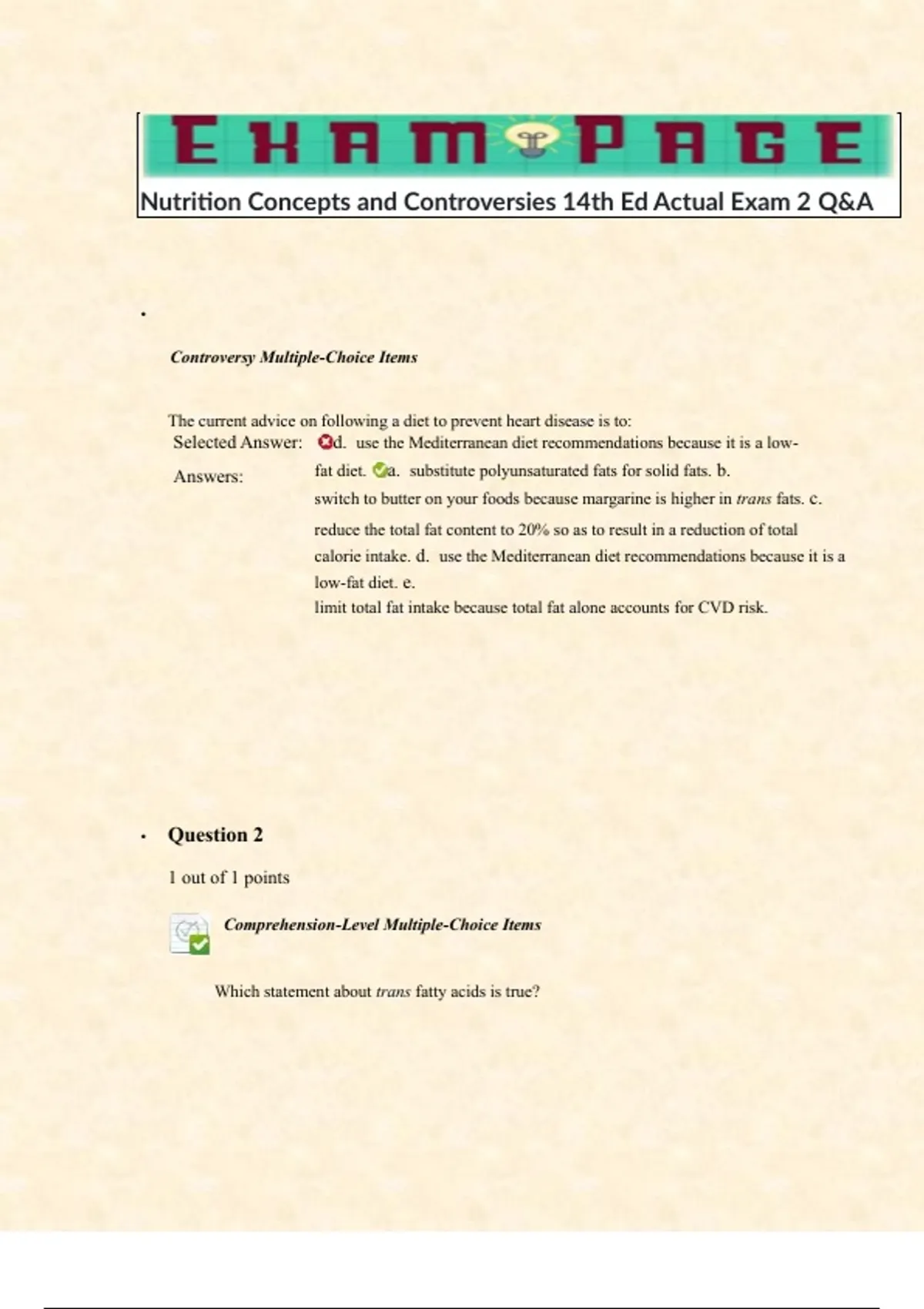 Nutrition Concepts and Controversies 14th Ed Actual Exam 2 Q&A • Controversy Multiple-Choice Items The current advice on following a diet to prevent heart disease is to: Selected Answer: Answers: d. use the Mediterranean diet recommendations because it is a low-fat diet. a. substitute polyunsaturated fats for solid fats. b. switch to butter on your foods because margarine is higher in trans fats. c. reduce the total fat content to 20% so as to result in a reduction of total calorie intake. d. use the Mediterranean diet recommendations because it is a low-fat diet. e. limit total fat intake because total fat alone accounts for CVD risk. • Question 2 1 out of 1 points Comprehension-Level Multiple-Choice Items Which statement about trans fatty acids is true? Selected Answer: Answers: d. They arise when polyunsaturated oils are hydrogenated. a. Their amounts are never listed on food labels. b. They have a beneficial effect on cholesterol transport throughout the body. c. They occur naturally in foods to a large extent. d. They arise when polyunsaturated oils are hydrogenated. e. They are made by the body. • Question 3 1 out of 1 points Application-Level Multiple-Choice Items Research on the benefits of fatty acids and their components has shown that: Selected Answer: Answers: b. seafood-consuming populations have a lower rate of death from heart disease. a. supplements of fish oil have improved depression. b. seafood-consuming populations have a lower rate of death from heart disease. c. within the brain, DHA may enhance inflammation associated with aging. d. every study reports lower cardiovascular risks with higher EPA and DHA intakes. e. omega-3 fatty acids have shown a definite benefit in preventing all forms of cancer. • Question 4 1 out of 1 points Comprehension-Level Multiple-Choice Items Health authorities recommend that adults consume _____ ounces of seafood per week. Selected Answer: a. 8-12 Answers: a. 8-12 b. 14-21 c. 5-7 d. 3-6 e. 2.5 • Question 5 1 out of 1 points Application-Level Multiple-Choice Items Ocean fish has been suggested to provide health benefits if eaten on a regular basis. What would be your recommendation for whether or not to eat fish? Selected Answer: Answers: e. Fatty fish has been shown in studies to be beneficial in reducing blood clotting. a. DHA in fish is harmful to eye development in the fetus if eaten during pregnancy. b. People with existing heart disease should never eat fish because of the danger of mercury contamination. c. Eating farm-raised fish would be a better option because it does not contain mercury. d. Eating fried fish will provide the greatest benefit from the omega-3 fats it contains. e. Fatty fish has been shown in studies to be beneficial in reducing blood clotting.