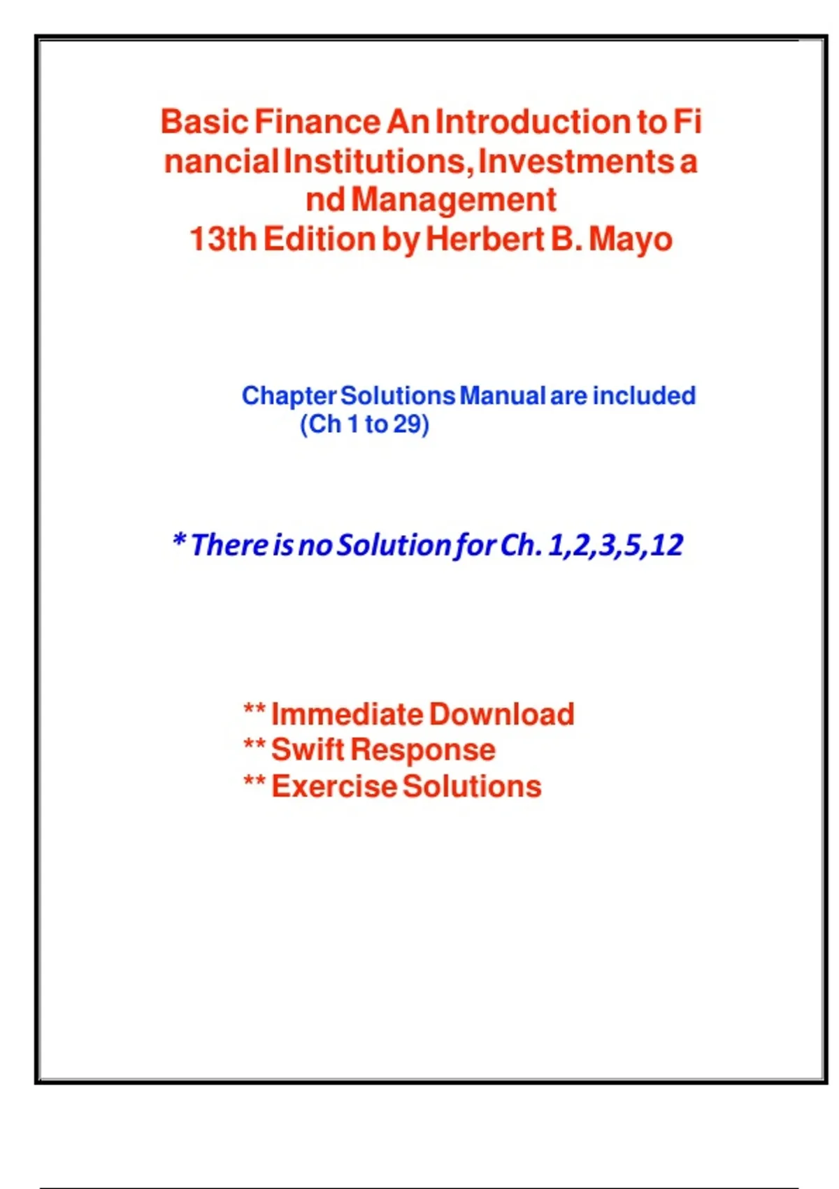 Get instant access to the complete Solutions Manual for Basic Finance: An Introduction to Financial Institutions, Investments, and Management (13th Edition) by Herbert B. Mayo. This comprehensive guide includes detailed, step-by-step solutions and answers for all exercises from Chapters 4, 6, 7, 8, 9, 10, 11, 13, 14, 15, 16, 17, 18, 19, 20, 21, and 22. Perfect for students and instructors, it covers key finance topics such as securities markets, stock and bond valuation, risk analysis, financial statements, cost of capital, capital budgeting, and more. Enhance your understanding and ace your exams with this essential resource.