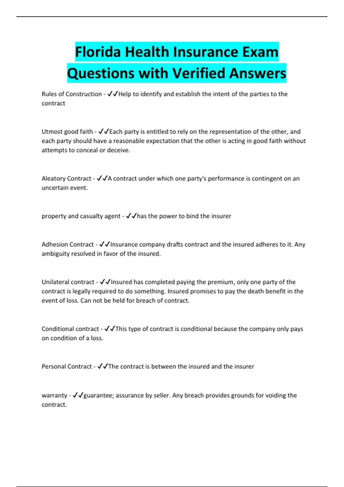 Florida Health Insurance Exam Questions with Verified Answers