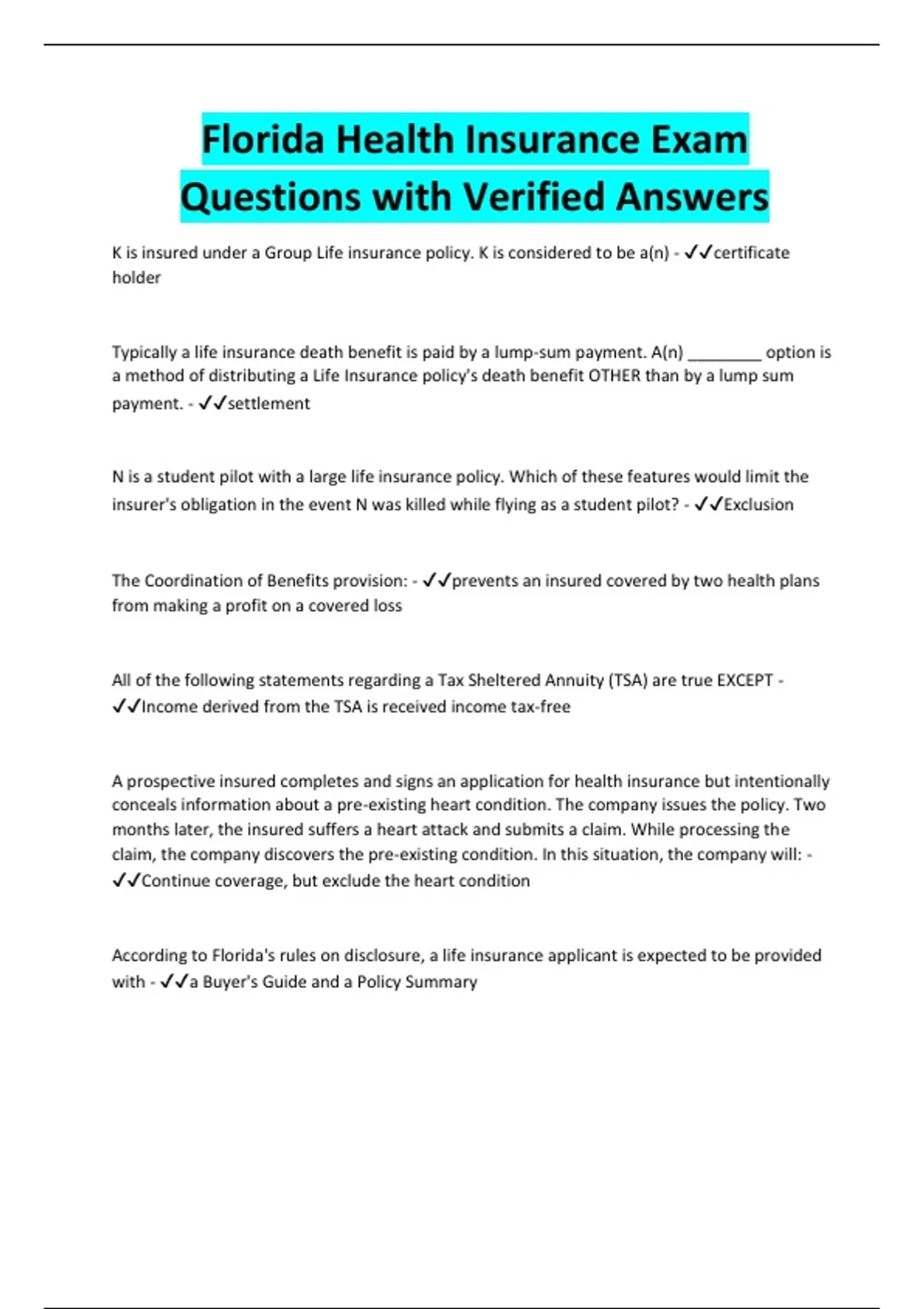 Florida Health Insurance Exam Questions with Verified Answers