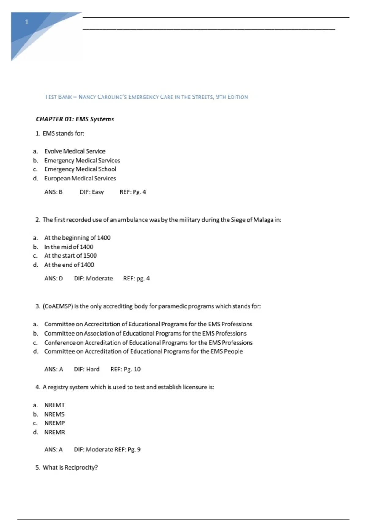 1 TEST BANK – NANCY CAROLINE’S EMERGENCY CARE IN THE STREETS, 9TH EDITION_________________________________@@@@@@@@@!