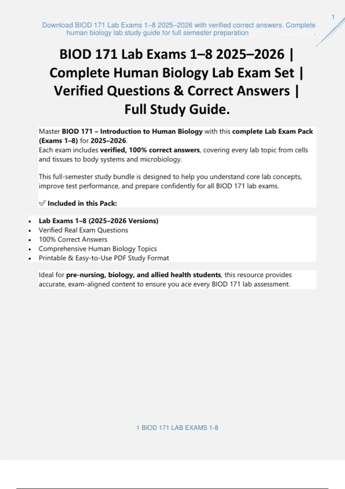 Download BIOD 171 Lab Exams 1–8 2025–2026 with verified correct answers. Complete