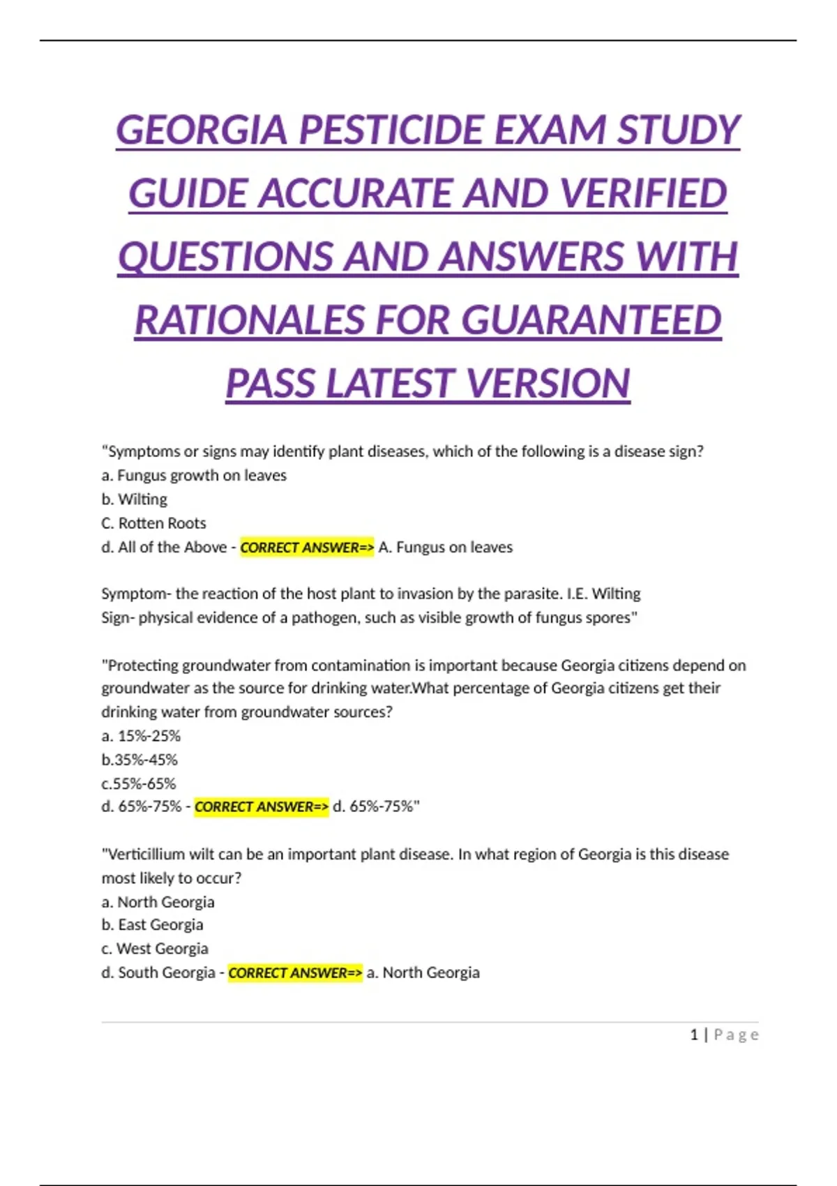 GEORGIA PESTICIDE EXAM STUDY GUIDE ACCURATE AND VERIFIED QUESTIONS AND ANSWERS WITH RATIONALES FOR GUARANTEED PASS LATEST VERSION