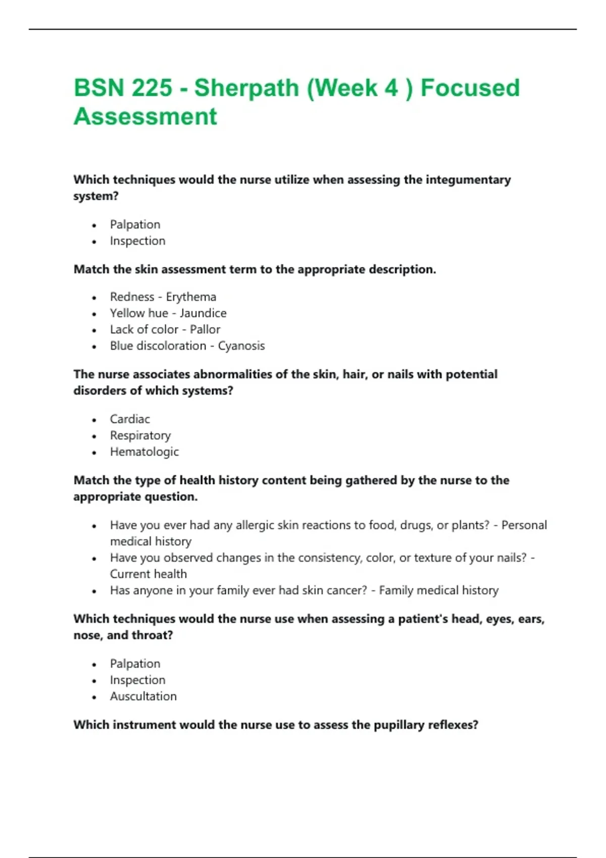 BSN 225 - Sherpath (Week 4 ) Focused Assessment Questions & Answers Already Graded A+