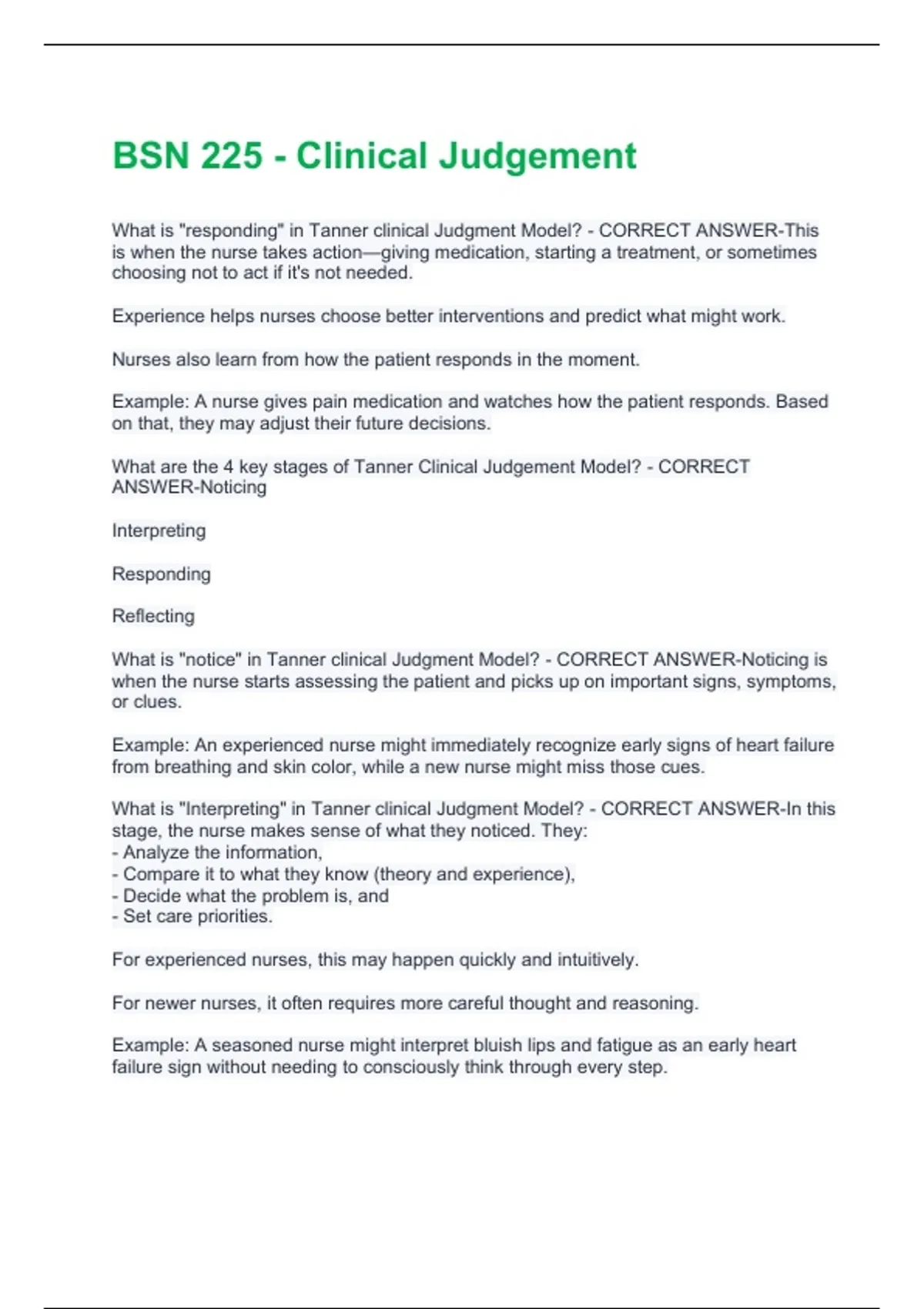 What is "responding" in Tanner clinical Judgment Model? - CORRECT ANSWER-This is when the nurse takes action—giving medication, starting a treatment, or sometimes choosing not to act if it's not needed. Experience helps nurses choose better interventions and predict what might work. Nurses also learn from how the patient responds in the moment. Example: A nurse gives pain medication and watches how the patient responds. Based on that, they may adjust their future decisions. What are the 4 key stages of Tanner Clinical Judgement Model? - CORRECT ANSWER-Noticing Interpreting Responding Reflecting What is "notice" in Tanner clinical Judgment Model? - CORRECT ANSWER-Noticing is when the nurse starts assessing the patient and picks up on important signs, symptoms, or clues. Example: An experienced nurse might immediately recognize early signs of heart failure from breathing and skin color, while a new nurse might miss those cues. What is "Interpreting" in Tanner clinical Judgment Model? - CORRECT ANSWER-In this stage, the nurse makes sense of what they noticed. They: - Analyze the information, - Compare it to what they know (theory and experience), - Decide what the problem is, and - Set care priorities. For experienced nurses, this may happen quickly and intuitively. For newer nurses, it often requires more careful thought and reasoning. Example: A seasoned nurse might interpret bluish lips and fatigue as an early heart failure sign without needing to consciously think through every step.