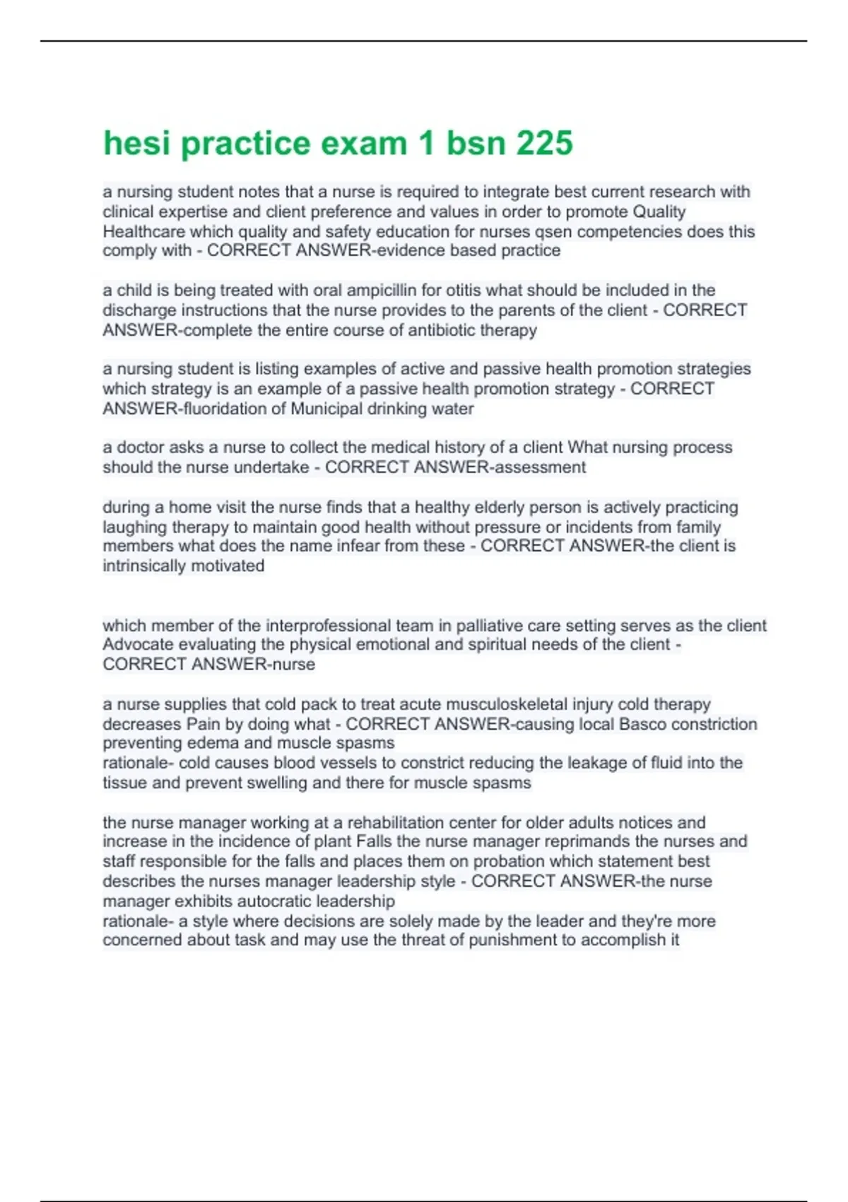 a nursing student notes that a nurse is required to integrate best current research with clinical expertise and client preference and values in order to promote Quality Healthcare which quality and safety education for nurses qsen competencies does this comply with - CORRECT ANSWER-evidence based practice a child is being treated with oral ampicillin for otitis what should be included in the discharge instructions that the nurse provides to the parents of the client - CORRECT ANSWER-complete the entire course of antibiotic therapy a nursing student is listing examples of active and passive health promotion strategies which strategy is an example of a passive health promotion strategy - CORRECT ANSWER-fluoridation of Municipal drinking water a doctor asks a nurse to collect the medical history of a client What nursing process should the nurse undertake - CORRECT ANSWER-assessment during a home visit the nurse finds that a healthy elderly person is actively practicing laughing therapy to maintain good health without pressure or incidents from family members what does the name infear from these - CORRECT ANSWER-the client is intrinsically motivated which member of the interprofessional team in palliative care setting serves as the client Advocate evaluating the physical emotional and spiritual needs of the client - CORRECT ANSWER-nurse a nurse supplies that cold pack to treat acute musculoskeletal injury cold therapy decreases Pain by doing what - CORRECT ANSWER-causing local Basco constriction preventing edema and muscle spasms rationale- cold causes blood vessels to constrict reducing the leakage of fluid into the tissue and prevent swelling and there for muscle spasms the nurse manager working at a rehabilitation center for older adults notices and increase in the incidence of plant Falls the nurse manager reprimands the nurses and staff responsible for the falls and places them on probation which statement best describes the nurses manager leadership style - CORRECT ANSWER-the nurse manager exhibits autocratic leadership rationale- a style where decisions are solely made by the leader and they're more concerned about task and may use the threat of punishment to accomplish it