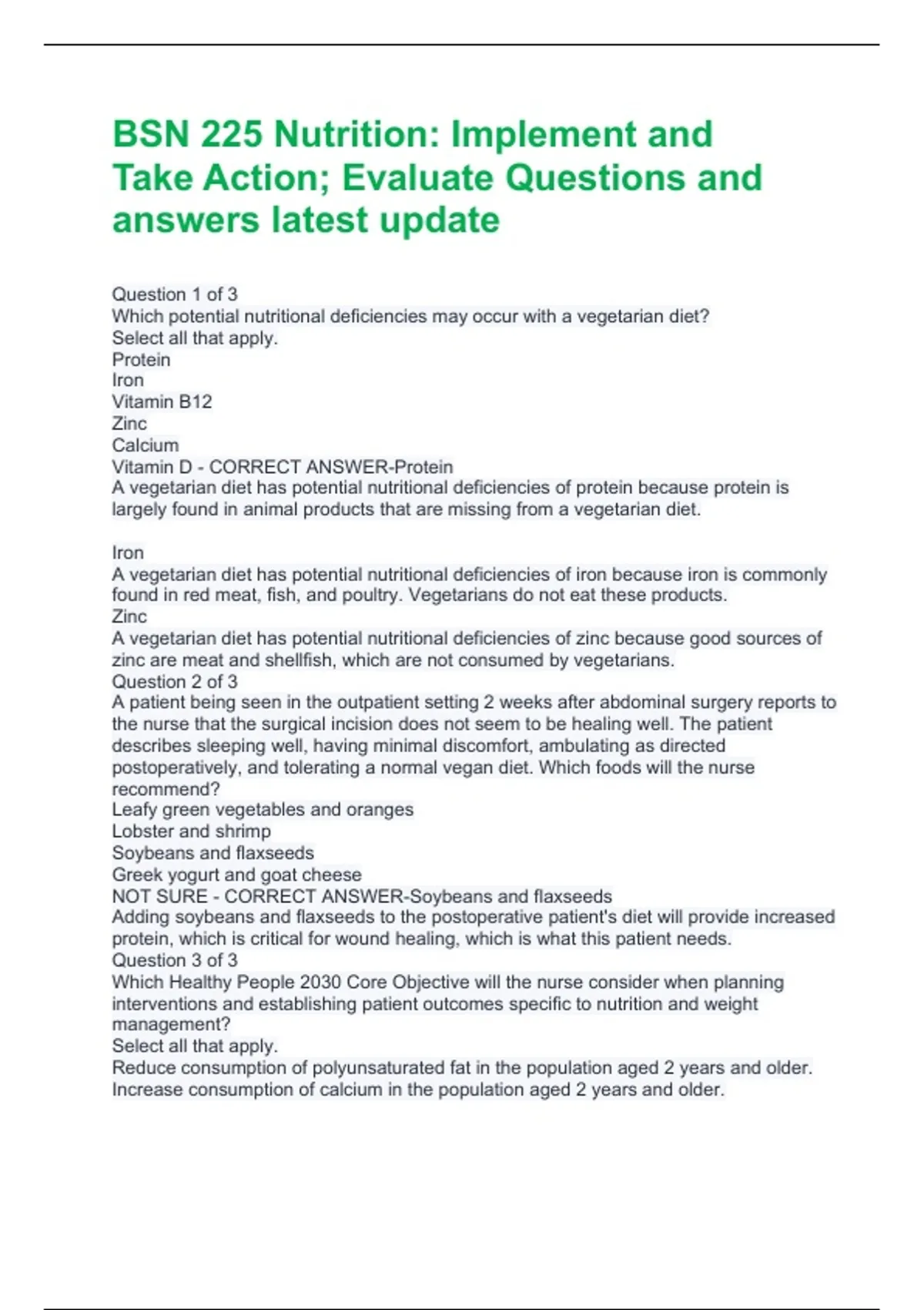 Question 1 of 3 Which potential nutritional deficiencies may occur with a vegetarian diet? Select all that apply. Protein Iron Vitamin B12 Zinc Calcium Vitamin D - CORRECT ANSWER-Protein A vegetarian diet has potential nutritional deficiencies of protein because protein is largely found in animal products that are missing from a vegetarian diet. Iron A vegetarian diet has potential nutritional deficiencies of iron because iron is commonly found in red meat, fish, and poultry. Vegetarians do not eat these products. Zinc A vegetarian diet has potential nutritional deficiencies of zinc because good sources of zinc are meat and shellfish, which are not consumed by vegetarians. Question 2 of 3 A patient being seen in the outpatient setting 2 weeks after abdominal surgery reports to the nurse that the surgical incision does not seem to be healing well. The patient describes sleeping well, having minimal discomfort, ambulating as directed postoperatively, and tolerating a normal vegan diet. Which foods will the nurse recommend? Leafy green vegetables and oranges Lobster and shrimp Soybeans and flaxseeds Greek yogurt and goat cheese NOT SURE - CORRECT ANSWER-Soybeans and flaxseeds Adding soybeans and flaxseeds to the postoperative patient's diet will provide increased protein, which is critical for wound healing, which is what this patient needs. Question 3 of 3 Which Healthy People 2030 Core Objective will the nurse consider when planning interventions and establishing patient outcomes specific to nutrition and weight management? Select all that apply. Reduce consumption of polyunsaturated fat in the population aged 2 years and older. Increase consumption of calcium in the population aged 2 years and older.Increase consumption of vitamin D in the population aged 2 years and older. Decrease consumption of potassium in the population aged 2 years and older. Reduce iron deficiency among females aged 12 to 49 years - CORRECT ANSWERncrease consumption of calcium in the population aged 2 years and older. Increase consumption of vitamin D in the population aged 2 years and older. Reduce iron deficiency among females aged 12 to 49 years Question 1 of 4 Which interventions related to mouth care would the nurse take for a patient who is NPO (nothing by mouth)? Select all that apply. Providing small sips of water Brushing teeth Rinsing the mouth with water Providing hard candy Using mouthwash - CORRECT ANSWER-Brushing teeth Rinsing the mouth with water Using mouthwash Question 2 of 4 Which items are included in a clear liquid diet? Milk, juices with pulp, popsicles Gelatin, chicken broth, apple juice Strained soup, milk, cranberry juice Yogurt, gelatin, apple juice - CORRECT ANSWER-Gelatin, chicken broth, apple juice A clear liquid diet includes gelatin, clear juices, popsicles, and clear broths. Question 3 of 4 Foods with a high glycemic index should be avoided in which diet? Cardiac Diabetic Mechanical soft Renal - CORRECT ANSWER-Question 3 of 4 Foods with a high glycemic index should be avoided in which diet? Cardiac Diabetic Mechanical soft Renal Question 4 of 4 Assistance in feeding is appropriate to use for patients with which conditions? Select all that apply. Limited mobility of hands and arms Limited mobility of feet and legs Poor activity tolerance Poor cognitive state Immobile NOT SURE - CORRECT ANSWER-Limited mobility of hands and arms Poor activity tolerance Poor cognitive stateQuestion 1 of 5 Which description is appropriate for a percutaneous endoscopic gastrostomy (PEG) tube? A feeding tube placed in the stomach through one of the nares A feeding tube placed in the jejunum through one of the nares A feeding tube surgically placed through an incision in the abdomen An intravenous solution placed in a vein - CORRECT ANSWER-A feeding tube surgically placed through an incision in the abdomen A feeding tube surgically placed through an incision in the abdomen is a PEG tube. Question 2 of 5 Which nursing responsibilities are related to percutaneous endoscopic gastrostomy (PEG) tube care? Select all that apply. Flushing the tube regularly Flushing the tube only prior to use Documenting skin assessment Assessing skin around the tube Not changing the dressing until soiled - CORRECT ANSWER-Flushing the tube regularly Documenting skin assessment Assessing skin around the tube Question 3 of 5 Medications administered through a feeding tube should be in liquid form or ground into powder as permitted and dissolved in mL of sterile water before instillation into the tube. Use numbers only. - CORRECT ANSWER-15-30