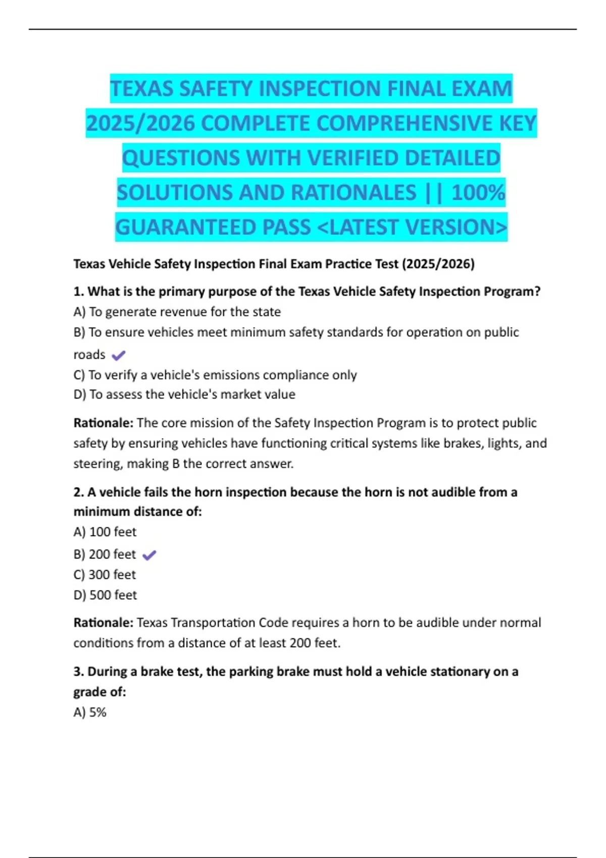 Texas Vehicle Safety Inspection Final Exam Practice Test (2025/2026)