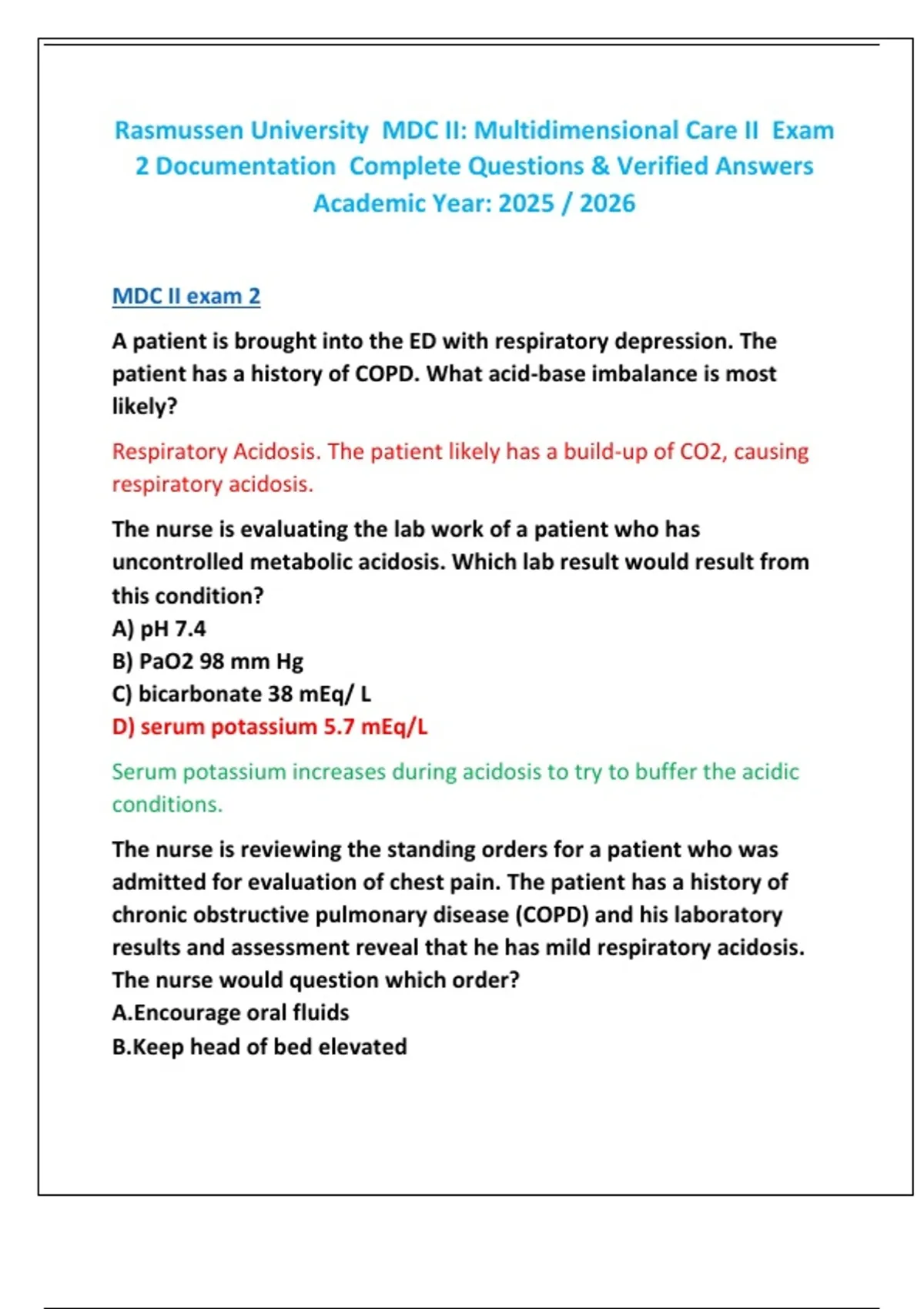 MDC II: Multidimensional Care II An advanced nursing course focused on the management of patients with complex health conditions across multiple systems. MDC II: Multidimensional Care II builds on foundational nursing knowledge, emphasizing clinical reasoning, evidence-based practice, and collaborative care. Students develop skills in prioritization, critical thinking, and patient-centered care for acute and chronic conditions. Rasmussen University MDC II: Multidimensional Care II Exam 2 Documentation Complete Questions & Verified Answers Academic Year: 2025 / 2026