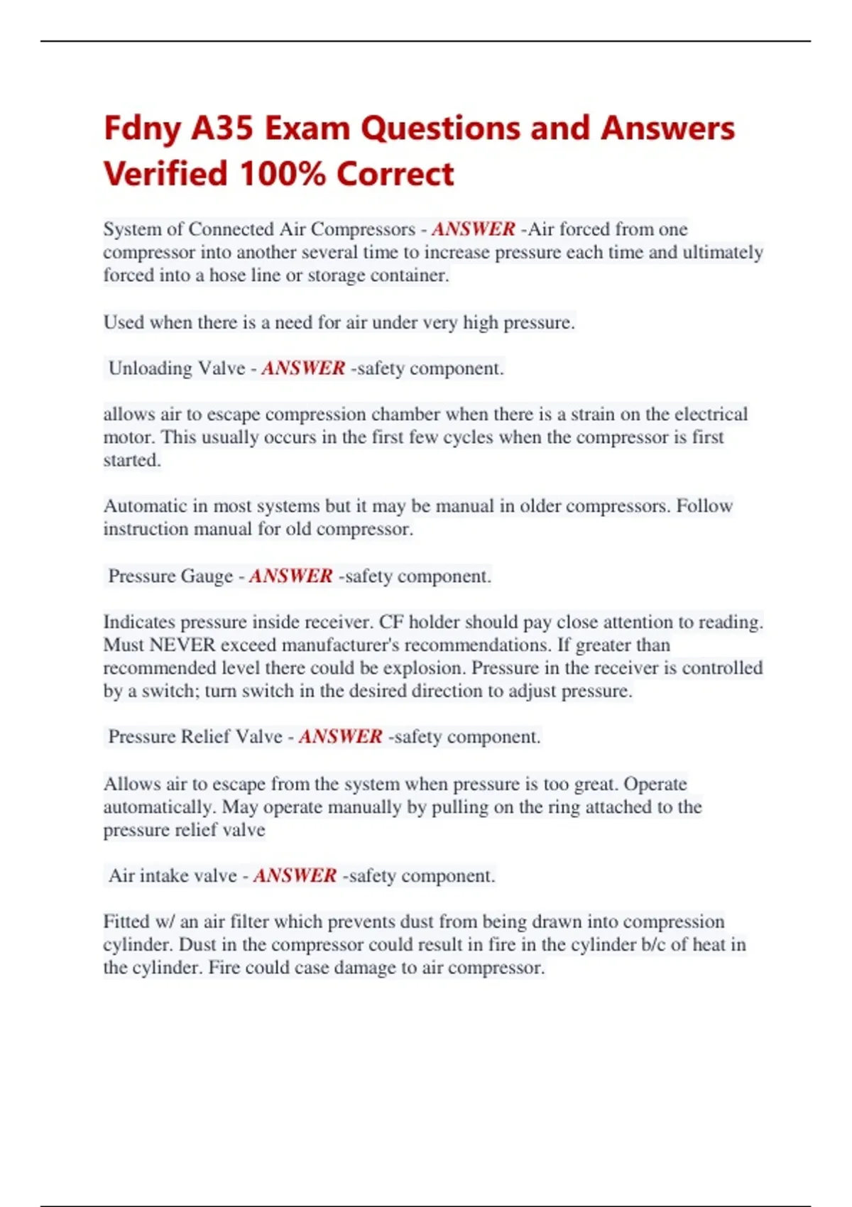 Fdny A35 Exam Questions and Answers Verified 100% Correct System of Connected Air Compressors - ANSWER -Air forced from one compressor into another several time to increase pressure each time and ultimately forced into a hose line or storage container. Used when there is a need for air under very high pressure. Unloading Valve - ANSWER -safety component. allows air to escape compression chamber when there is a strain on the electrical motor. This usually occurs in the first few cycles when the compressor is first started. Automatic in most systems but it may be manual in older compressors. Follow instruction manual for old compressor. Pressure Gauge - ANSWER -safety component. Indicates pressure inside receiver. CF holder should pay close attention to reading. Must NEVER exceed manufacturer's recommendations. If greater than recommended level there could be explosion. Pressure in the receiver is controlled by a switch; turn switch in the desired direction to adjust pressure. Pressure Relief Valve - ANSWER -safety component. Allows air to escape from the system when pressure is too great. Operate automatically. May operate manually by pulling on the ring attached to the pressure relief valve Air intake valve - ANSWER -safety component. Fitted w/ an air filter which prevents dust from being drawn into compression cylinder. Dust in the compressor could result in fire in the cylinder b/c of heat in the cylinder. Fire could case damage to air compressor. This is why its important to make sure filter is always clean and securely connected to the compressor. Filter & Moisture Separator Assembly (FMSA) - ANSWER -safety component. Moisture can be a problem; this filter removes moisture from compressed air. Installed between compressor and receiver. Drain cock attached to FMSA to drain water and dirt. Automatic Control Device - ANSWER -Attached to receiver. Shuts down compressor when pressure in receiver is adequate and restarts when more pressure needed. Safety Relief Valves - ANSWER -safety component. keep compressor tank from bursting if pressures witch stops working Constant Speed Control Switch - ANSWER -safety component. Used when steady/constant demand for compressed air. If demand drops excess compressed air is released through pressure release valve. Cooling system - ANSWER -safety component. compression chamber and compressed air must be cooled to avoid overheating. Small compressors are air-cooled (fan). Large compressors are water-cooled. Low Oil Level Indicator Switch - ANSWER -safety component. automatically shut down compressor if oil is low. Serious damage can be caused if compressor is operated w/ low oil Maintenance & Repairing Compressor- General Requirements - ANSWER - always follow guidelines outlined by manufacturer. Repair: -always turned off -electrical supply shutdown -air drained -made by qualified technician Repairs by CF - ANSWER --must know how to correct cooling system; -may replace belts -change air filter -change lubrication oil Leaks - ANSWER -CF must look & listen for leaks. More prominent in colder months when sealing materials shrink. Most leakage occurs at tubing and fittings at air reciever tank. Heat & Compressor - ANSWER --never place combustible materials nearby; -do not use near devices that produce heat; solar heat is not known to cause overheating CF Responsibility - ANSWER --visually inspect -remain in area for a few minutes after compressor started -do not operate at speeds above recommended ranged Injury from Compressor - ANSWER --Dust or debris blow off clothing can be driven under skin causing DEATH -Eardrum ruptures at 40 PSI -Air entering mouth can destroy lungs and internal organs -Eyesight (always wear googles) Hydrostatic testing - ANSWER -Fire Code no longer requires affidavit indicating reciever is hydrostactically tested and defect free. HOWEVER, test every 5 years at a minimum is reccomended.