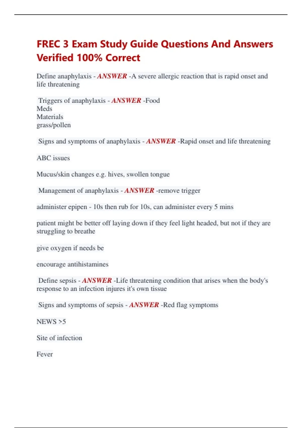 FREC 3 Exam Study Guide Questions And Answers Verified 100% Correct Define anaphylaxis - ANSWER -A severe allergic reaction that is rapid onset and life threatening Triggers of anaphylaxis - ANSWER -Food Meds Materials grass/pollen Signs and symptoms of anaphylaxis - ANSWER -Rapid onset and life threatening ABC issues Mucus/skin changes e.g. hives, swollen tongue Management of anaphylaxis - ANSWER -remove trigger administer epipen - 10s then rub for 10s, can administer every 5 mins patient might be better off laying down if they feel light headed, but not if they are struggling to breathe give oxygen if needs be encourage antihistamines Define sepsis - ANSWER -Life threatening condition that arises when the body's response to an infection injures it's own tissue Signs and symptoms of sepsis - ANSWER -Red flag symptoms NEWS >5 Site of infection Fever Reg flag sepsis/sepsis shock - ANSWER -Lactate 2mmol Unable to keep sats above 92% without o2 Hypotension Tachycardia tachypnoea Non-blanching rash recent chemo VPU not passed urine in last 18 hours Treatment of sepsis - ANSWER -Give o2 IV fluids if hypotensive Cause of seizure - ANSWER -electrical imbalance in brain 3 types of seizure - ANSWER -absence partial/focal seizure generalised seizure Management of seizure - ANSWER -make sure to time it give o2 if needs be protect their head Cause of meningitis - ANSWER -infection of the meninges (the 3 layers that surround the CNS and contain CSF) Signs and symptoms of meningitis - ANSWER -stiff neck fever cold periphery sensitivity to light meningococcal rash Management of meningitis - ANSWER -Give o2 if needs paramedic will give penicillin 2 types of stroke - ANSWER -Vascular stroke (blood vessel expands and presses on brain) Ischaemic stroke (blockage in blood vessel) (TIA) - temporary ischaemic stroke Management of stroke - ANSWER -BM -> BP -> BEFAST -> note the time What is angina - ANSWER -pain in the chest caused by partial blockage of coronary artery, limiting blood supply to myocardium 2 types of angina - ANSWER -stable (happens with stress/exertion) unstable (happens at rest) Signs and symptoms of angina - ANSWER -tightness pain spread to jaw, neck, back and arms belching Management of angina - ANSWER -Aspirin GTN sit down and relax role of aspirin - ANSWER -Prevent platlets clotting role of GTN - ANSWER -vasodilation What is a MI - ANSWER -blockage in coronary artery preventing blood accessing myocardium Signs and symptoms of myocardial infarction - ANSWER -Grey skin Sweating Pain nausea Lightheaded Urge to pee Management of MI - ANSWER -Aspirin - prevent clotting GTN - vasodilation o2 if needs be Role of blood - ANSWER -Transport of nutrients - o2, glucose