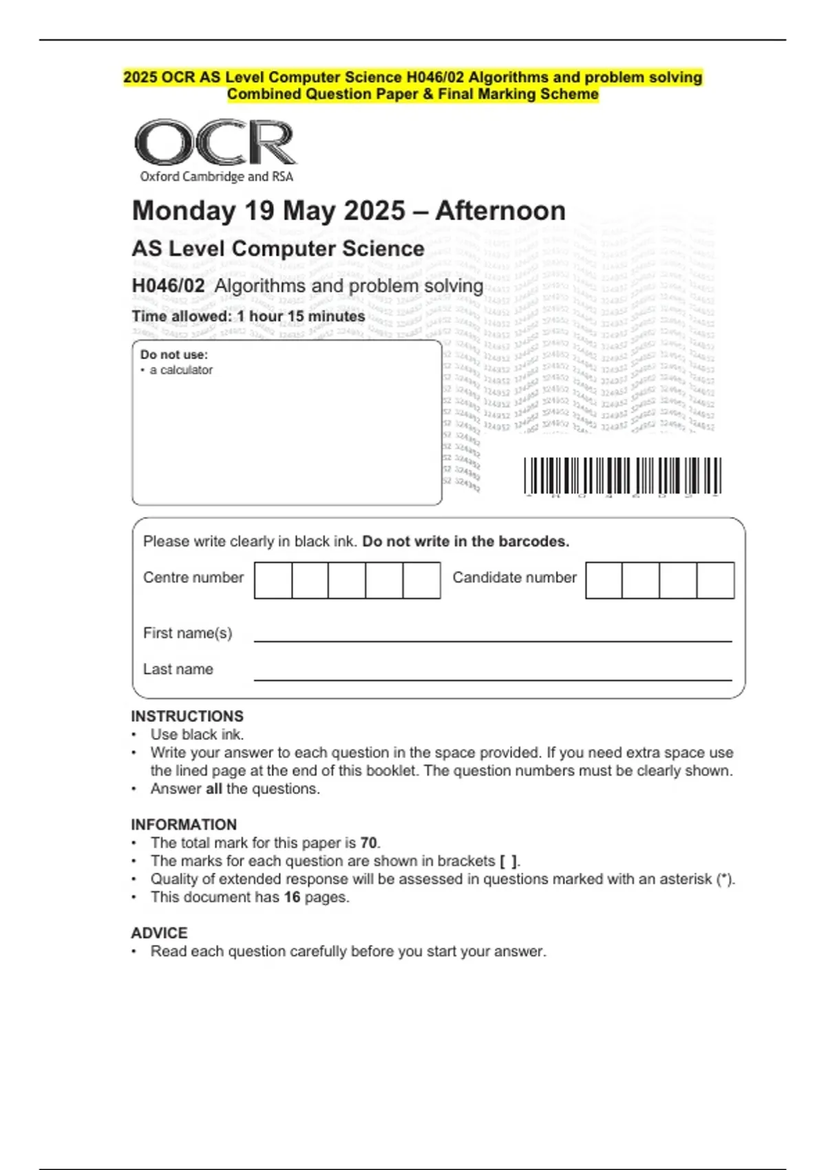 H046/02 Algorithms and problem solving