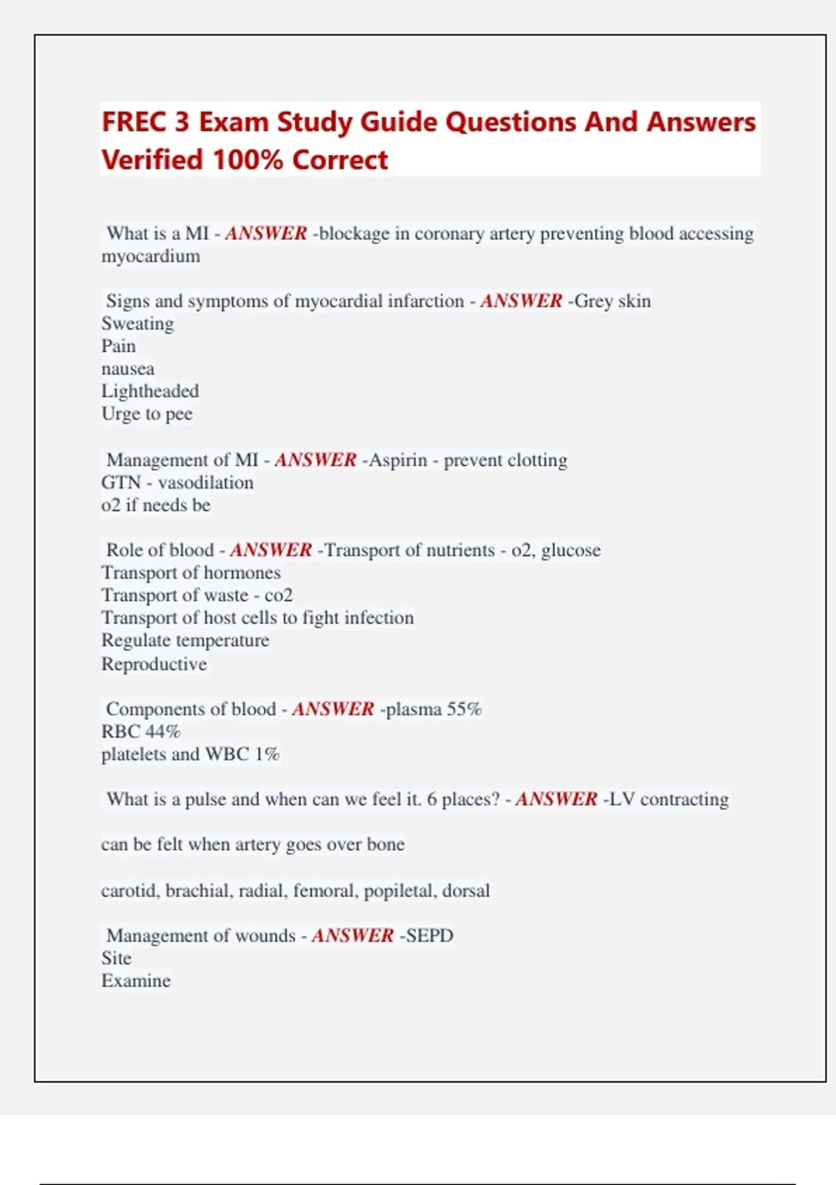 FREC 3 Exam Study Guide Questions And Answers Verified 100% Correct What is a MI - ANSWER -blockage in coronary artery preventing blood accessing myocardium Signs and symptoms of myocardial infarction - ANSWER -Grey skin Sweating Pain nausea Lightheaded Urge to pee Management of MI - ANSWER -Aspirin - prevent clotting GTN - vasodilation o2 if needs be Role of blood - ANSWER -Transport of nutrients - o2, glucose Transport of hormones Transport of waste - co2 Transport of host cells to fight infection Regulate temperature Reproductive Components of blood - ANSWER -plasma 55% RBC 44% platelets and WBC 1% What is a pulse and when can we feel it. 6 places? - ANSWER -LV contracting can be felt when artery goes over bone carotid, brachial, radial, femoral, popiletal, dorsal Management of wounds - ANSWER -SEPD Site Examine Pressure Dressing How to manage eye injuries - ANSWER -keep anything in cover both eyes to prevent eye movement in bad ete irrigate chemicals or fust Define shock - ANSWER -a lack of oxygen to tissues Types of shock - ANSWER -Dissociative - not enough RBC Obstructive - obstruction of blood to/from heart Hypovalemic - loss of blood volume Cardiogenic - cardiac Distributive - vasodilation Signs and symptoms of shock - ANSWER -Blood loss Confusion Increase HR increased RR dizziness cyanosis confusion cool peripheries pale anxiety and abnormal behaviour Management of shock - ANSWER -Step bleeding if hypovalemic raise legs, give o2, notify blood transport services Severity of burn (3 types) - ANSWER -Superficial, partial thickness, full thickness Management of burn - ANSWER -SCALD size, cause, age, location, depth cool with water if not chemical, put strips of clingflim on advise them to take painkillers Types of burn - ANSWER -chemical thermal friction radiation wet heat dry heat electrical time critical features of burns - ANSWER -significant face/chest burn circumferential burns ABC issues hot air or hot gas inhalation burns covering more than 15% of adult, 10% children presence of other major injuries What is hypothermia - 3 stages - ANSWER -<28 severe 28-32 moderate 32-35 mild Who is at risk of hypothermic - ANSWER -Children Elderley Drowned patients Immobile Signs and symptoms of hypothermia - ANSWER -Shivering Confusion Cyanosis Unconscious Exhaustion management of hypothermia - ANSWER -warm slowly remove wet clothes, wrap in foil blanket do not give hot food/drink What is hyperthermia - ANSWER ->40 degrees Stages of hyperthermia - ANSWER -Heat stress -> heat exhaustion -> heat stroke Cause of hyperthermia - ANSWER -Too much exercise