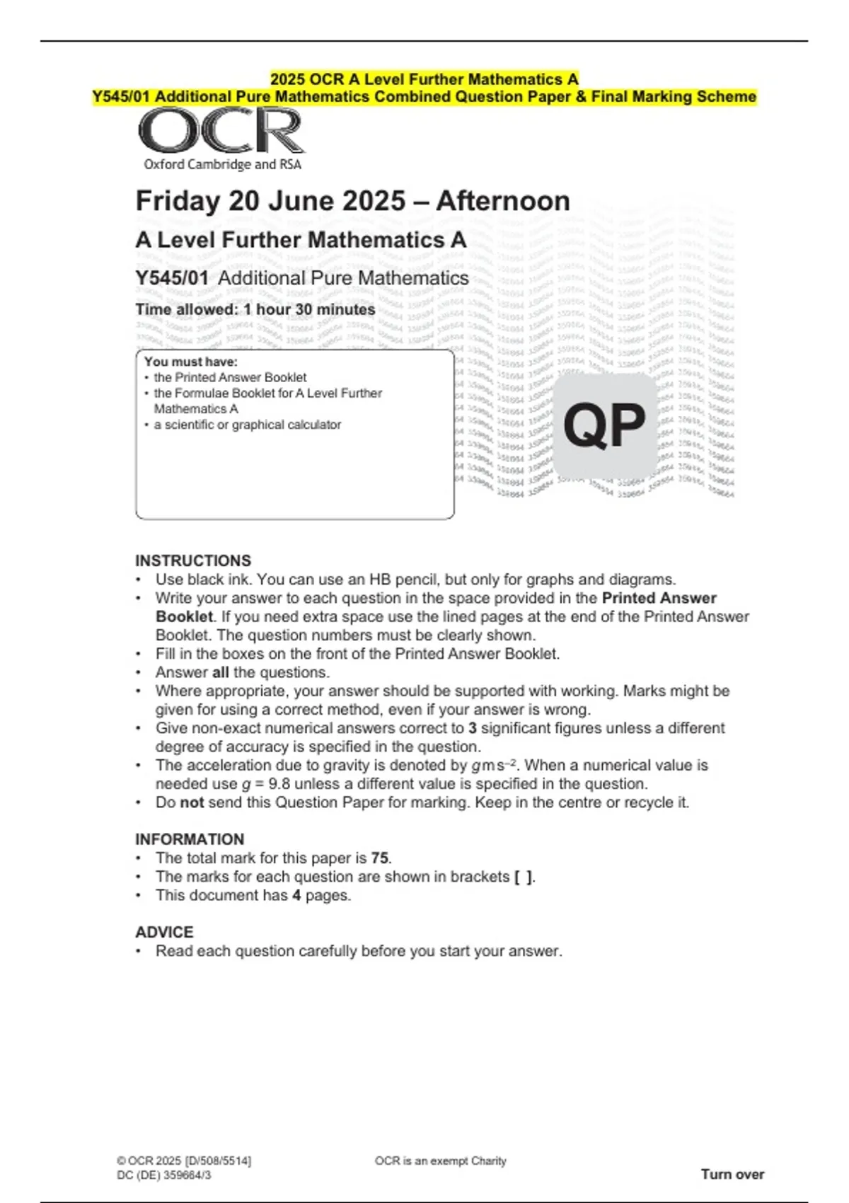 Y545/01 Additional Pure Mathematics Combined Question Paper & Final Marking Scheme