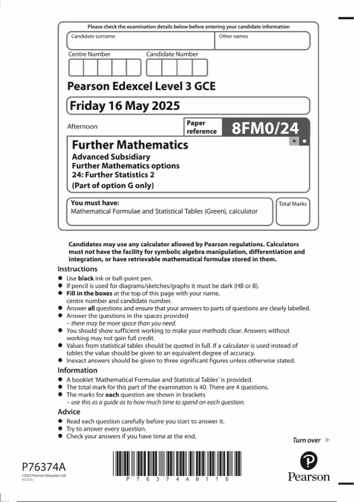 Pearson Edexcel Level 3 GCE Further Mathematics paper 24 2025 (8FM0/24: Further Statistics 1 part of option g only)