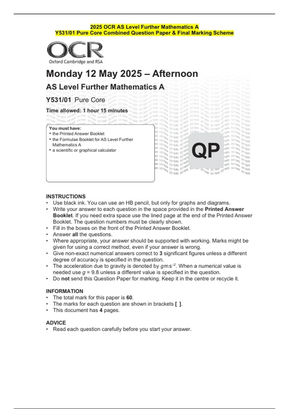 2025 OCR AS Level Further Mathematics A Y531/01 Pure Core Combined Question Paper & Final Marking Scheme
