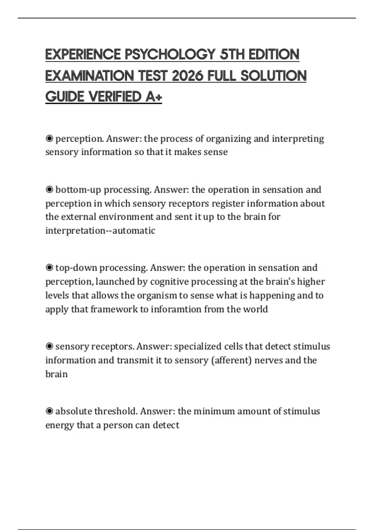EXPERIENCE PSYCHOLOGY 5TH EDITION EXAMINATION TEST 2026 FULL SOLUTION GUIDE VERIFIED A+