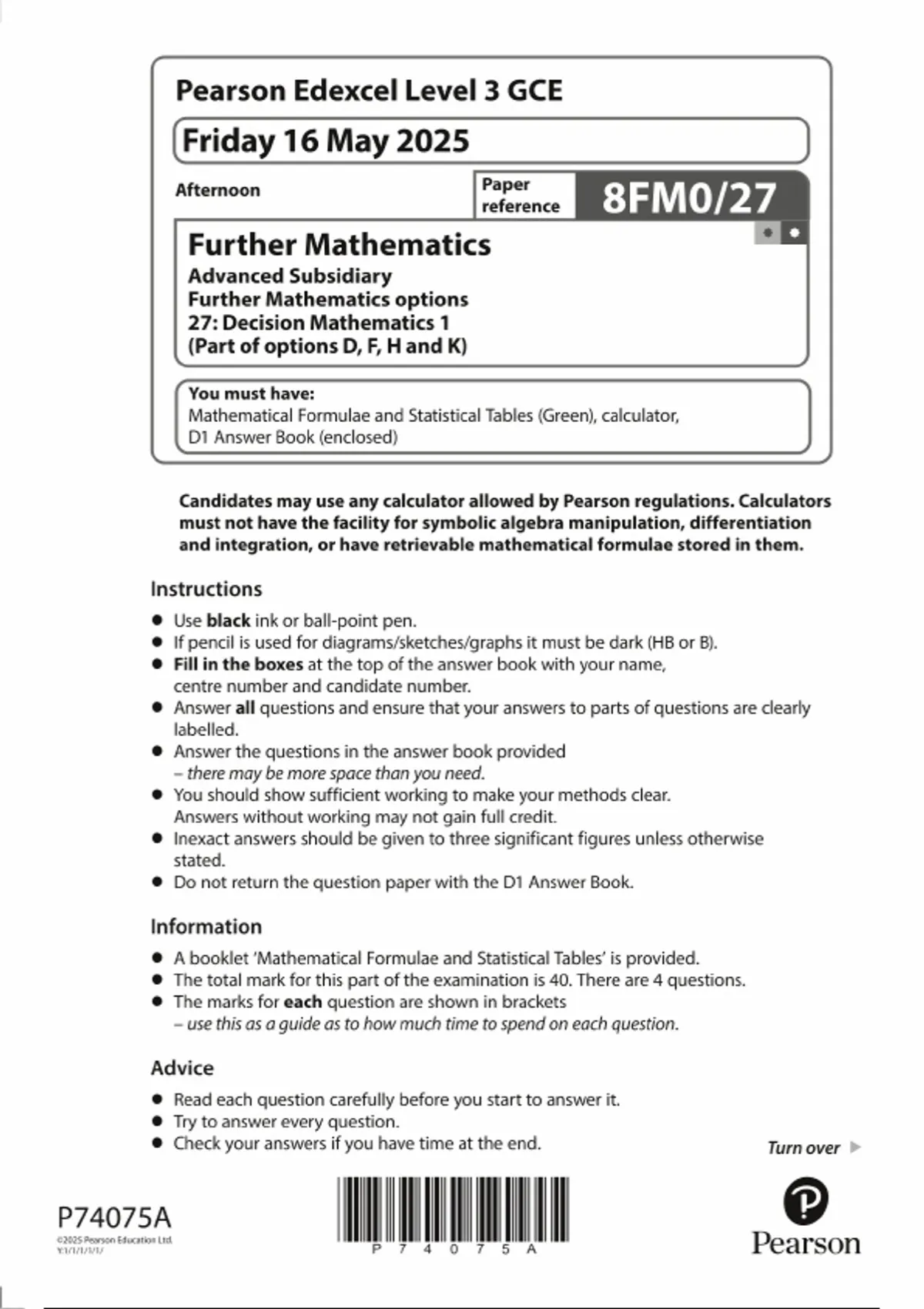 Pearson Edexcel Level A Further Mathematics options 27 2025 (8FM0/27:: Decision Mathematics 1 (Part of options D, F, H and K) )