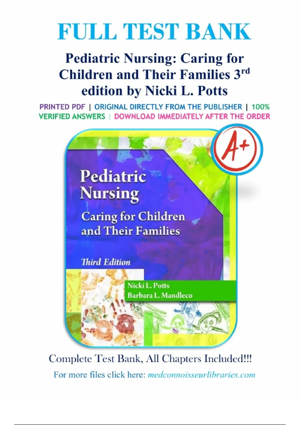.Test Bank for Pediatric Nursing Caring for Children and Their Families 3rd Edition By Potts. Table of Contents Unit I: PEDIATRIC NURSING IN A CHANGING SOCIETY. 1. Overview of Pediatric Nursing. 2. Legal and Ethical Issues. 3. The Child in Context of the Family. 4. Community and Home Health Nursing. 5. School Nursing. Unit II: GROWTH AND DEVELOPMENT OF CHILDREN. 6. Theoretical Approaches to the Growth and Development of Children. 7. Growth and Development of the Newborn. 8. Growth and Development of the Infant. 9. Growth and Development of the Toddler. 10. Growth and Development of the Preschooler. 11. Growth and Development of the School-Aged Child. 12. Growth and Development of the Adolescent. Unit III: UNIQUE CONSIDERATIONS IN CHILDREN. 13. Child and Family Communication. 14. Pediatric Assessment. 15. Infectious Diseases. 16. Care of Children Who Are Hospitalized. 17. Chronic Conditions. 18. Pain Management. 19. Medication Administration. 20. Loss and Bereavement. Unit IV: ALTERATIONS IN NUTRITION AND ELIMINATION. 21. Fluid and Electrolyte Alterations.22. Genitourinary Alterations. 23. Gastrointestinal Alterations. Unit V: ALTERATIONS IN OXYGEN TRANSPORT. 24. Respiratory Alterations. 25. Cardiovascular Alterations. 26. Hematological Alterations. Unit VI: ALTERATIONS IN PROTECTIVE MECHANISMS. 27. Immunologic Alterations. 28. Endocrine Alterations. 29. Cellular Alterations. 30. Integumentary Alterations. Unit VII: Alterations in Sensorimotor Function. 31. Sensory Alterations. 32. Neurological Alterations. 33. Cognitive Alterations. 34. Musculoskeletal Alterations. Unit VIII: OTHER ALTERATIONS TO CHILDRENS HEALTH. 35. Psychosocial Alterations. 36. Child Abuse and Neglect.