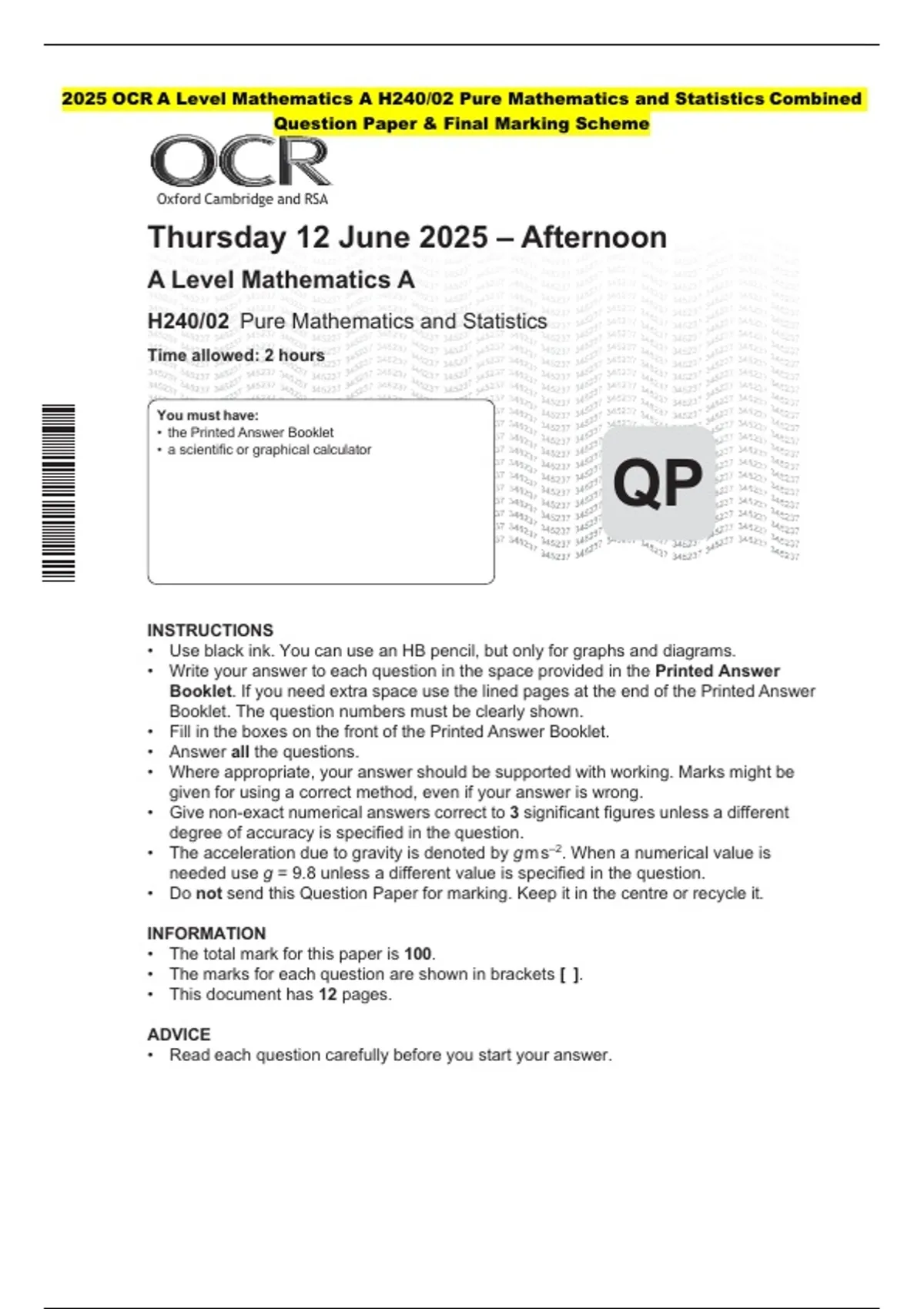 H240/02 Pure Mathematics and Statistics
