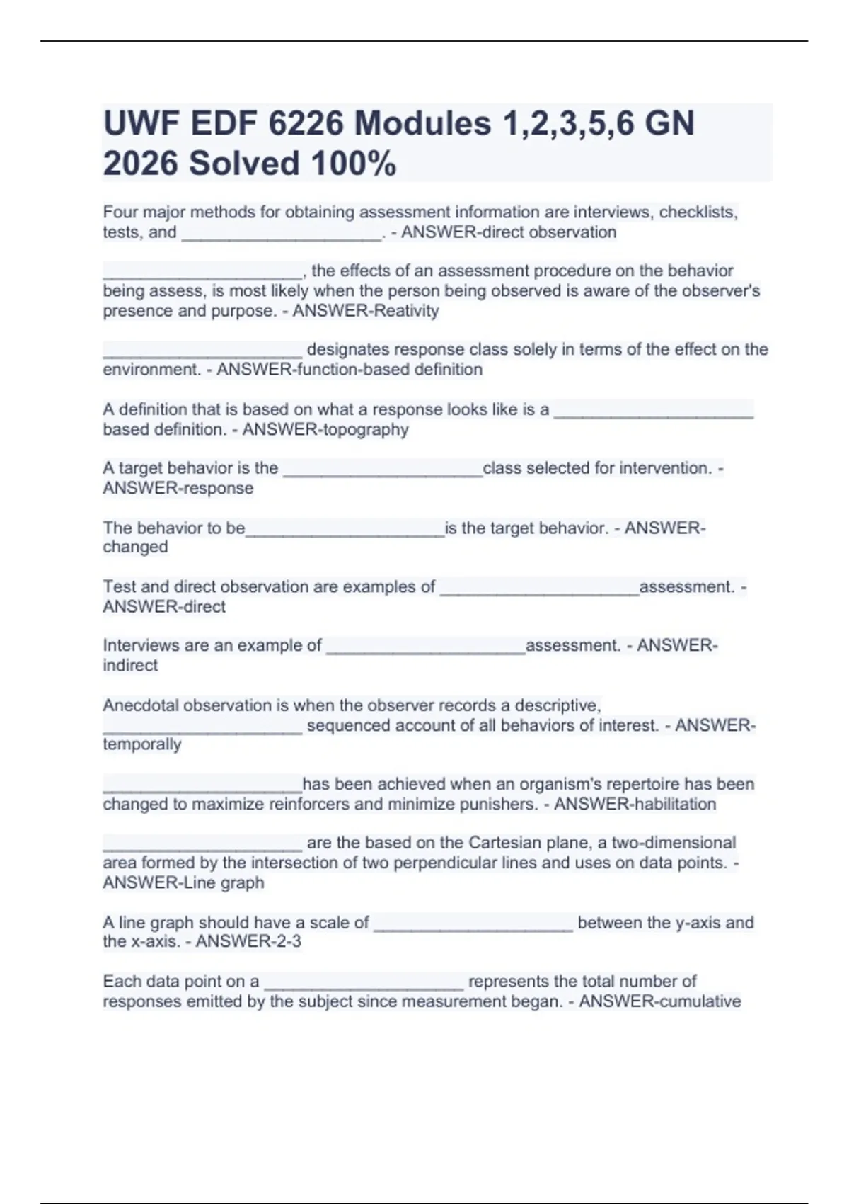 This document provides the fully solved answers for EDF 6226 at the University of West Florida (UWF), covering Modules 1, 2, 3, 5, and 6. It includes accurate and verified solutions for discussion questions, quizzes, and assignments. The material addresses key concepts in educational foundations, research methods, learning theories, and instructional strategies, making it a reliable resource for students aiming for top grades in EDF 6226.