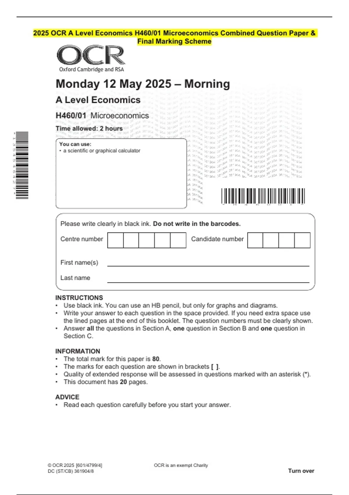2025 OCR A Level Economics H460/01 Microeconomics Combined Question Paper &
