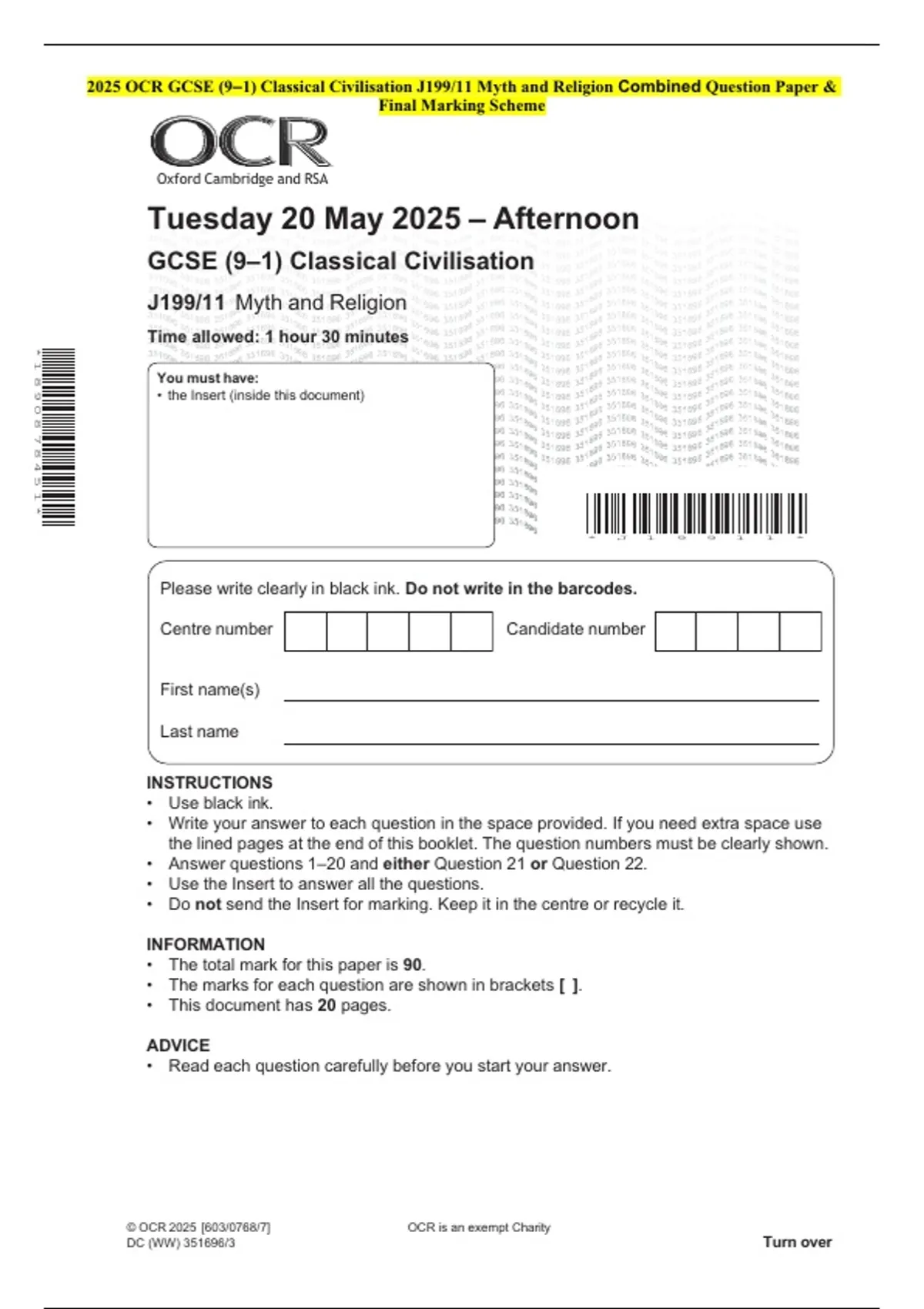 2025 OCR GCSE (9–1) Classical Civilisation J199/11 Myth and Religion Combined Question Paper &