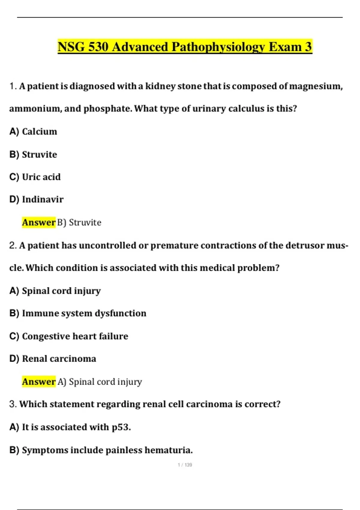 This document provides a complete set of multiple-choice questions and detailed answers for the NSG 530 Advanced Pathophysiology Exam 3. It covers renal, reproductive, gastrointestinal, cardiovascular, endocrine, and shock pathophysiology, including key mechanisms, disease manifestations, diagnostic findings, and pharmacologic management. The material is organized in a Q&A format and is ideal for nursing students preparing for exams or clinical application reviews.