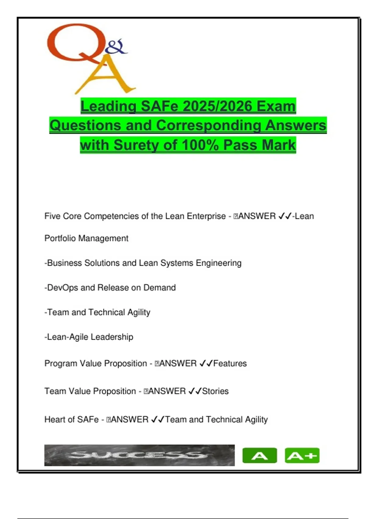 This comprehensive exam preparation document contains 43 verified multiple-choice questions and answers for the Leading SAFe 2025/2026 certification, based on the Scaled Agile Framework (SAFe). It is tailored to align with the most recent SAFe guidelines and best practices, covering a wide range of high-yield topics such as Lean Portfolio Management, DevOps and Release on Demand, Team and Technical Agility, Business Solutions and Lean Systems Engineering, and Agile Release Trains (ARTs). The questions are accompanied by clear and confident answers, making this resource particularly effective for students and professionals aiming for a 100% pass rate on the official Leading SAFe certification exam. Whether you are new to SAFe or refreshing your expertise, this document supports deep understanding and readiness for the latest version of the exam. This material is highly recommended for students in Business Administration, Information Technology, Software Engineering, and Project Management courses. It is also useful for professionals preparing for roles such as SAFe Program Consultant (SPC), Scrum Master, Agile Coach, or Release Train Engineer (RTE). Learners enrolled in Agile certification programs or enterprise-level project management modules will also benefit from the structured exam content. Keywords: SAFe exam, SAFe certification 2025, Lean Portfolio Management, Agile Release Train, DevOps, Scaled Agile Framework, Agile leadership, SAFe questions and answers, Continuous Delivery Pipeline, Business agility, Agile transformation