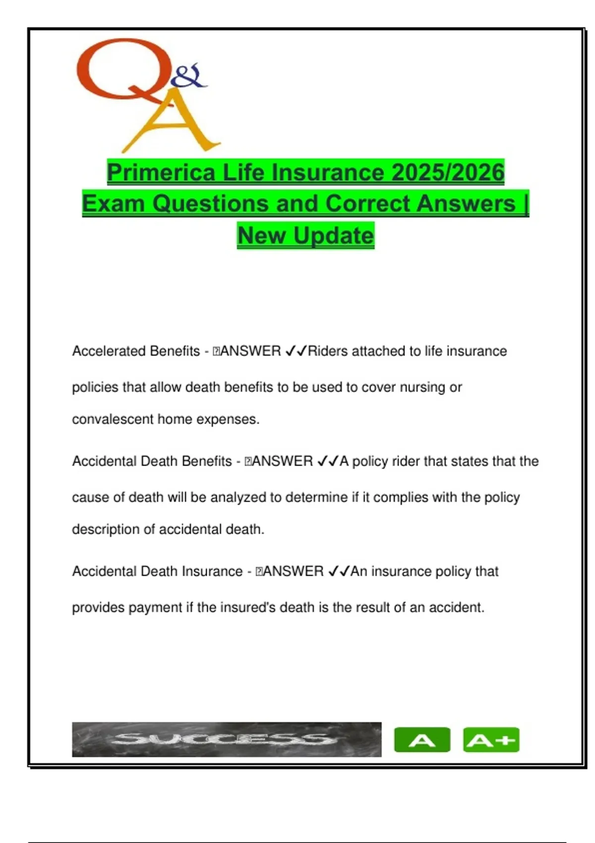 This document contains over 250 updated questions and correct answers covering essential terms, legal concepts, and product knowledge required for the Primerica Life Insurance licensing exam 2025/2026. Written in a clear, concise Q&A format, it is designed to help candidates understand life insurance policies, underwriting practices, agent authority, and ethical responsibilities, as outlined in U.S. state insurance licensing standards. Core areas of focus include: Life Insurance Riders and Policy Types (accelerated benefits, accidental death, adjustable and whole life, term insurance, universal life, nonforfeiture values) Insurance Contracts and Principles (adhesion, aleatory, unilateral contracts, utmost good faith, warranties, representations) Agent Responsibilities and Authority (express, implied, apparent authority; fiduciary duty; commissions; licensing types) Legal Definitions and Claims Process (beneficiaries, assignment, claim procedures, policy loans, death benefits, grace period) Risk Management and Underwriting (risk types, moral/morale hazards, insurable interest, adverse selection, law of large numbers) Market Practices and Ethics (twisting, rebating, coercion, concealment, misrepresentation, defamation, fraud) Annuities, Premiums, and Retirement Plans (qualified/nonqualified plans, ERISA, annuity types, accumulation/maturity periods) Group and Individual Insurance, agent licensing terms, consumer protection laws, and state regulatory requirements This resource is suitable for: Individuals preparing for the Primerica life insurance licensing exam New insurance agents entering the field through Primerica or other financial services firms Business, finance, and risk management students in licensing prep courses Candidates from U.S. programs including community colleges, online pre-licensing schools, and state insurance certification bodies Keywords: Primerica life insurance exam, insurance rider definitions, risk management, underwriting, agent authority, insurance ethics, ALEATORY contract, whole life insurance, premium grace period, term life, annuity, fraud insurance, licensing prep, US insurance exam 2025
